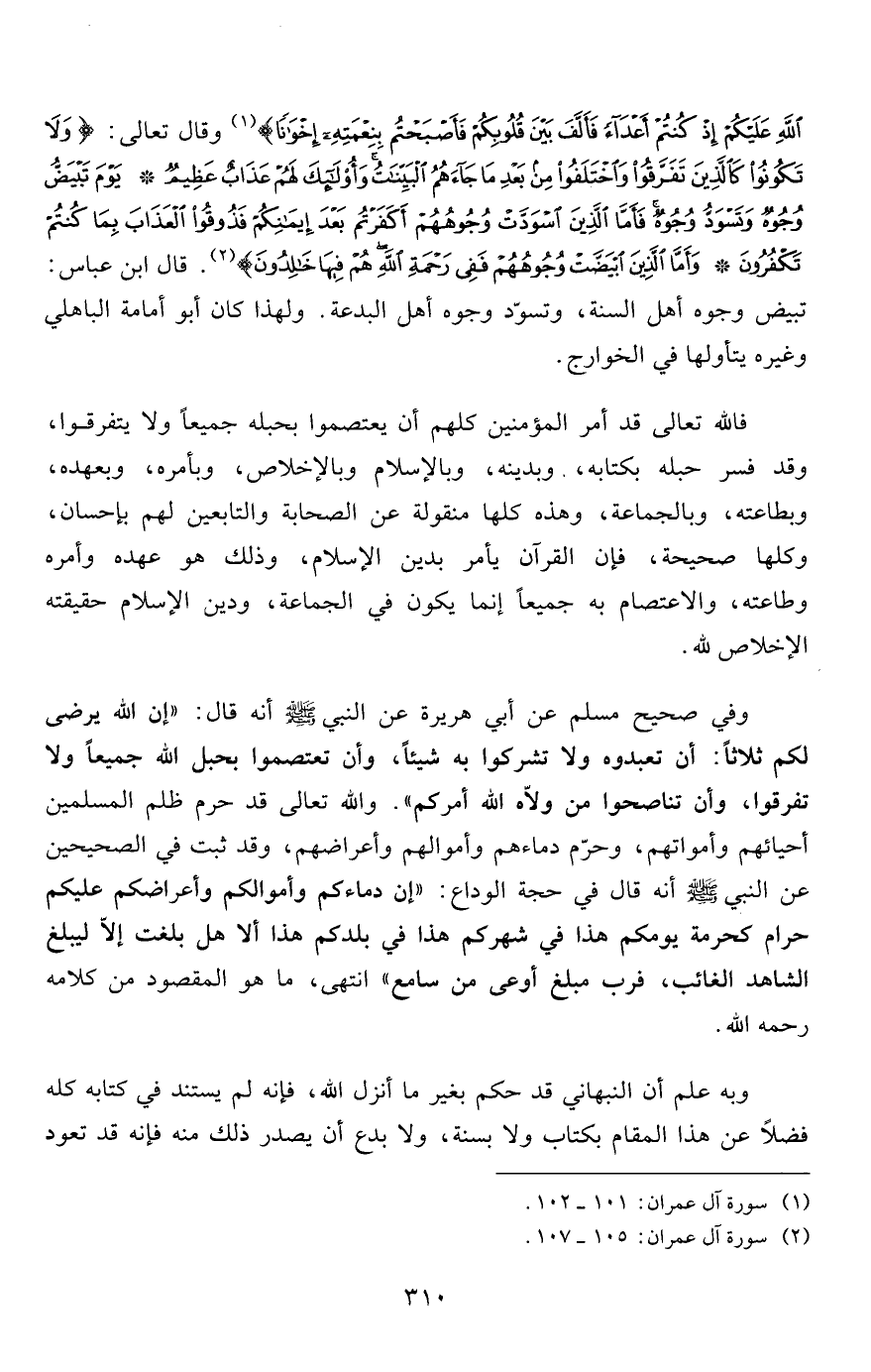 اللَّهِ عَلَيْكُمْ إِذْ كُنْتُمْ أَعْدَاءً فَأَلَّفَ بَيْنَ قُلُوبِكُمْ فَأَصْبَحْتُمْ بِنِعْمَتِهِ إِخْوَاناً} 1 وقال تعالى: {وَلا تَكُونُوا كَالَّذِينَ تَفَرَّقُوا وَاخْتَلَفُوا مِنْ بَعْدِ مَا جَاءَهُمُ الْبَيِّنَاتُ وَأُولَئِكَ لَهُمْ عَذَابٌ عَظِيمٌ * يَوْمَ تَبْيَضُّ وُجُوهٌ وَتَسْوَدُّ وُجُوهٌ فَأَمَّا الَّذِينَ اسْوَدَّتْ وُجُوهُهُمْ أَكَفَرْتُمْ بَعْدَ إِيمَانِكُمْ فَذُوقُوا الْعَذَابَ بِمَا كُنْتُمْ تَكْفُرُونَ * وَأَمَّا الَّذِينَ ابْيَضَّتْ وُجُوهُهُمْ فَفِي رَحْمَةِ اللَّهِ هُمْ فِيهَا خَالِدُونَ} 2. قال ابن عباس: تبيض وجوه أهل السنة، وتسود وجوه أهل البدعة. ولهذا كان أبو أمامة الباهلي وغيره يتأولها في الخوارج.