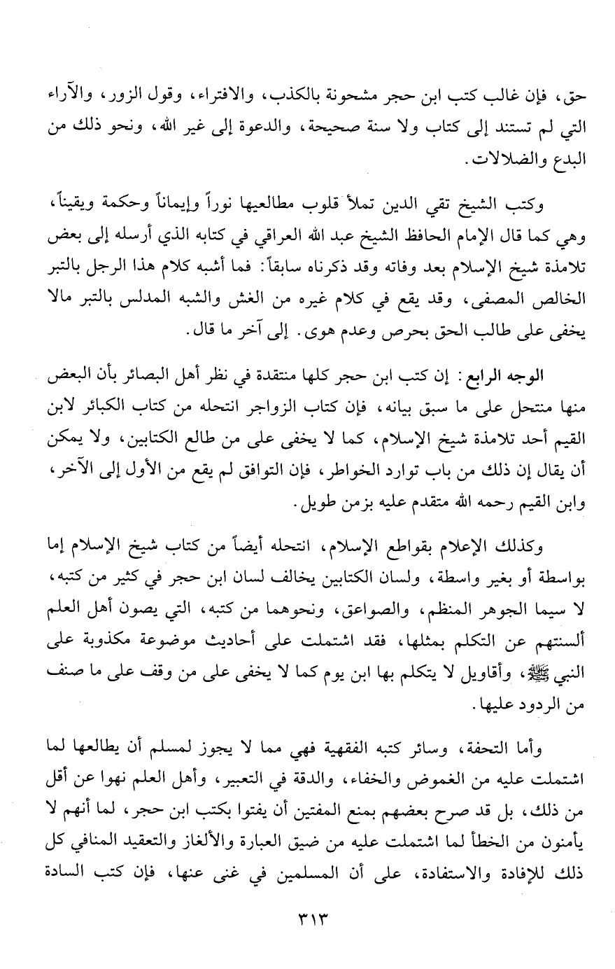 وكذلك الإعلام بقواطع الإسلام، انتحله أيضاً من كتاب شيخ الإسلام إما بواسطة أو بغير واسطة، ولسان الكتابين يخالف لسان ابن حجر في كثير من كتبه، لاسيما الجوهر المنظم، والصواعق، ونحوهما من كتبه، التي يصون أهل العلم ألسنتهم عن التكلم بمثلها، فقد اشتملت على أحاديث موضوعة مكذوبة على النبي صلى الله عليه وسلم، وأقاويل لا يتكلم بها ابن يوم كما لا يخفى على من وقف على ما صنف من الردود عليها.