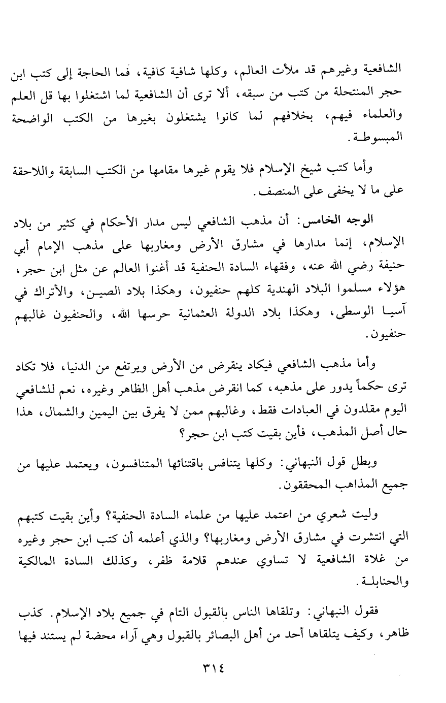 الوجه الخامس: أن مذهب الشافعي ليس مدار الأحكام في كثير من بلاد الإسلام، إنما مدارها في مشارق الأرض ومغاربها على مذهب الإمام أبي حنيفة رضي الله عنه، وفقهاء السادة الحنفية قد أغنوا العالم عن مثل ابن حجر، هؤلاء مسلموا البلاد الهندية كلهم حنفيون، وهكذا بلاد الصين، والأتراك في آسيا الوسطى، وهكذا بلاد الدولة العثمانية حرسها الله، والحنفيون غالبهم حنفيون.