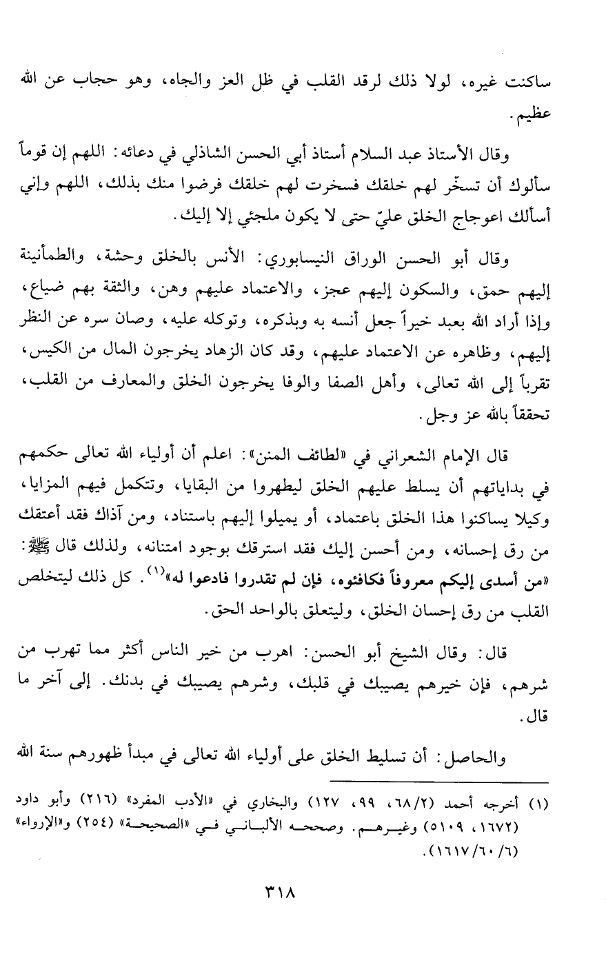 قال الإمام الشعراني في "لطائف المنن": اعلم أن أولياء الله تعالى حكمهم في بداياتهم أن يسلط عليهم الخلق ليطهروا من البقايا، وتتكمل فيهم المزايا، وكيلا يساكنوا هذا الخلق باعتماد، أو يميلوا إليهم باستناد، ومن آذاك فقد أعتقك من رق إحسانه، ومن أحسن إليك فقد استرقك بوجود امتنانه، ولذلك قال صلى الله عليه وسلم: "من أسدى إليكم معروفاً فكافئوه، فإن لم تقدروا فادعوا له"1. كل ذلك ليتخلص القلب من رق إحسان الخلق، وليتعلق بالواحد الحق.