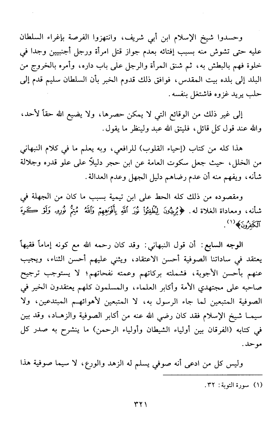 الوجه السابع: أن قول النبهاني: وقد كان رحمه الله مع كونه إماماً فقيهاً يعتقد في ساداتنا الصوفية أحسن الاعتقاد، ويثني عليهم أحسن الثناء، ويجيب عنهم بأحسن الأجوبة، فشملته بركاتهم وعمته نفحاتهم؛ لا يستوجب ترجيح صاحبه على مجتهدي الأمة وأكابر العلماء، والمسلمون كلهم يعتقدون الخير في الصوفية المتبعين لما جاء الرسول به، لا المتبعين لأهوائهم المبتدعين، ولاسيما شيخ الإسلام فقد كان رضي الله عنه من أكابر الصوفية والزهاد، وقد بين في كتابه (الفرقان بين أولياء الشيطان وأولياء الرحمن) ما ينشرح به صدر كل موحد.