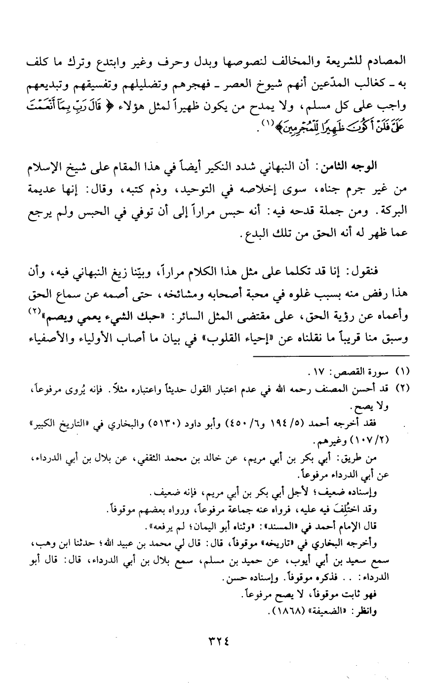 الوجه الثامن: أن النبهاني شدد النكير أيضاً في هذا المقام على شيخ الإسلام من غير جرم جناه، سوى إخلاصه في التوحيد، وذم كتبه، وقال: إنها عديمة البركة. ومن جملة قدحه فيه: أنه حبس مراراً إلى أن توفي في الحبس ولم يرجع عما ظهر له أنه الحق من تلك البدع.