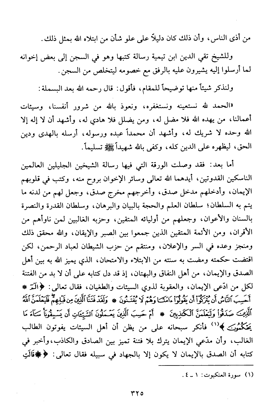 أما بعد: فقد وصلت الورقة التي فيها رسالة الشيخين الجليلين العالمين الناسكين القدوتين، أيدهما الله تعالى وسائر الإخوان بروح منه، وكتب في قلوبهم الإيمان، وأدخلهم مدخل صدق، وأخرجهم مخرج صدق، وجعل لهم من لدنه ما يتم به السلطان؛ سلطان العلم والحجة بالبيان والبرهان، وسلطان القدرة والنصرة بالسنان والأعوان، وجعلهم من أوليائه المتقين، وحزبه الغالبين لمن ناوأهم من الأقران، ومن الأئمة المتقين الذين جمعوا بين الصبر والإيقان، والله محقق ذلك ومنجز وعده في السر والإعلان، ومنتقم من حزب الشيطان لعباد الرحمن، لكن اقتضت حكمته ومضت به سنته من الابتلاء والامتحان، الذي يميز الله به بين أهل الصدق والإيمان، من أهل النفاق والبهتان، إذ قد دل كتابه على أن لا بد من الفتنة لكل من ادّعى الإيمان، والعقوبة لذوي السيئات والطغيان، فقال تعالى: {الم * أَحَسِبَ النَّاسُ أَنْ يُتْرَكُوا أَنْ يَقُولُوا آمَنَّا وَهُمْ لا يُفْتَنُونَ * وَلَقَدْ فَتَنَّا الَّذِينَ مِنْ قَبْلِهِمْ فَلَيَعْلَمَنَّ اللَّهُ الَّذِينَ صَدَقُوا وَلَيَعْلَمَنَّ الْكَاذِبِينَ * أَمْ حَسِبَ الَّذِينَ يَعْمَلُونَ السَّيِّئَاتِ أَنْ يَسْبِقُونَا سَاءَ مَا يَحْكُمُونَ} 1 فأنكر سبحانه على من يظن أن أهل السيئات يفوتون الطالب الغالب، وأن مدّعي الإيمان يترك بلا فتنة تميز بين الصادق والكاذب، وأخبر في كتابه أن الصدق بالإيمان لا يكون إلا بالجهاد في سبيله فقال تعالى: {قَالَتِ