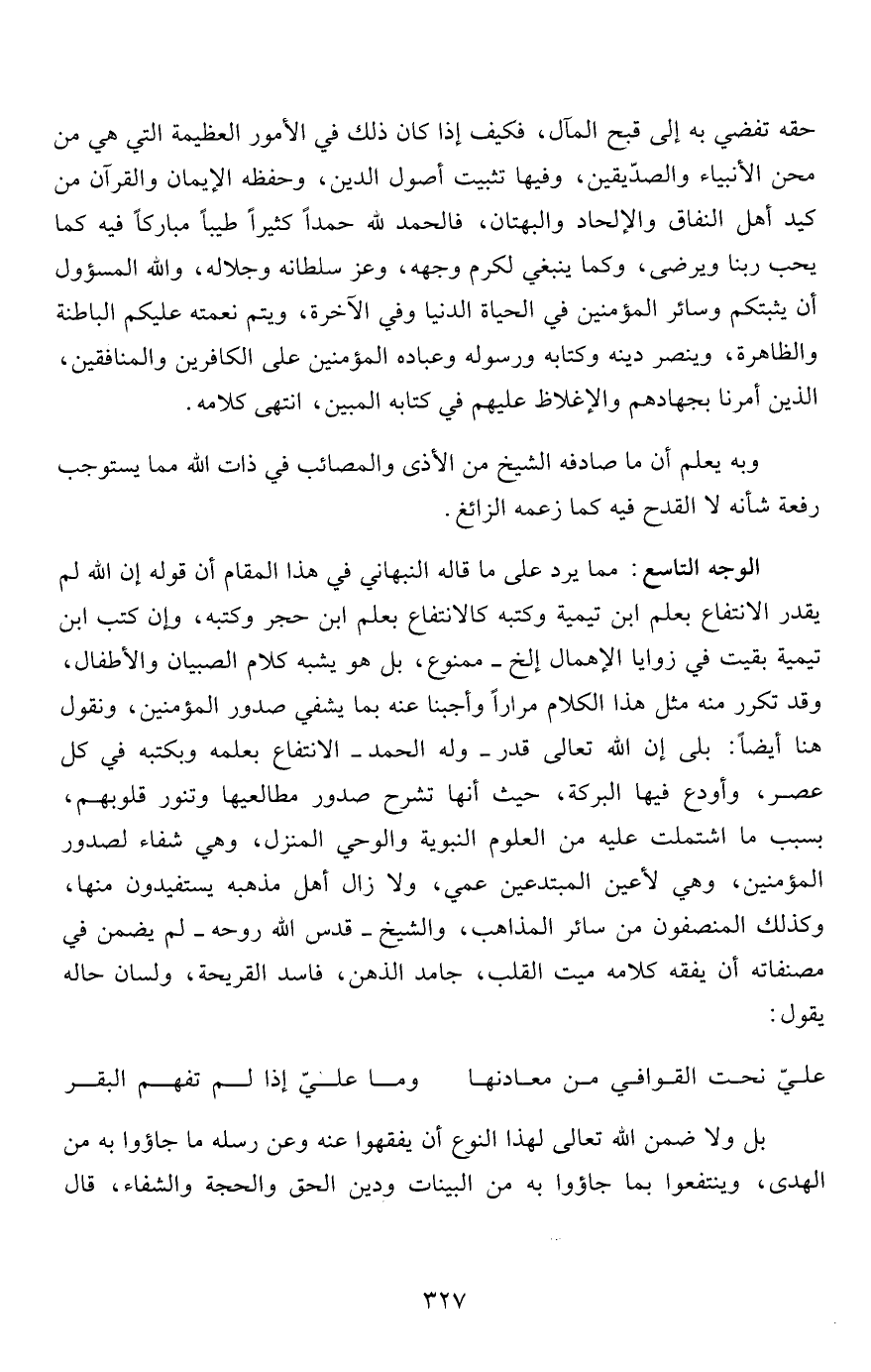الوجه التاسع: مما يرد على ما قاله النبهاني في هذا المقام أن قوله إن الله لم يقدر الانتفاع بعلم ابن تيمية وكتبه كالانتفاع بعلم ابن حجر وكتبه، وإن كتب ابن تيمية بقيت في زوايا الإهمال إلخ -ممنوع، بل هو يشبه كلام الصبيان والأطفال، وقد تكرر منه مثل هذا الكلام مراراً وأجبنا عنه بما يشفي صدور المؤمنين، ونقول هنا أيضاً: بلى إن الله تعالى قدر- وله الحمد- الانتفاع بعلمه وبكتبه في كل عصر، وأودع فيها البركة، حيث أنها تشرح صدور مطالعيها وتنور قلوبهم، بسبب ما اشتملت عليه من العلوم النبوية والوحي المنزل، وهي شفاء لصدور المؤمنين، وهي لأعين المبتدعين عمي، ولا زال أهل مذهبه يستفيدون منها، وكذلك المنصفون من سائر المذاهب، والشيخ- قدس الله روحه- لم يضمن في مصنفاته أن يفقه كلامه ميت القلب، جامد الذهن، فاسد القريحة، ولسان حاله يقول:
