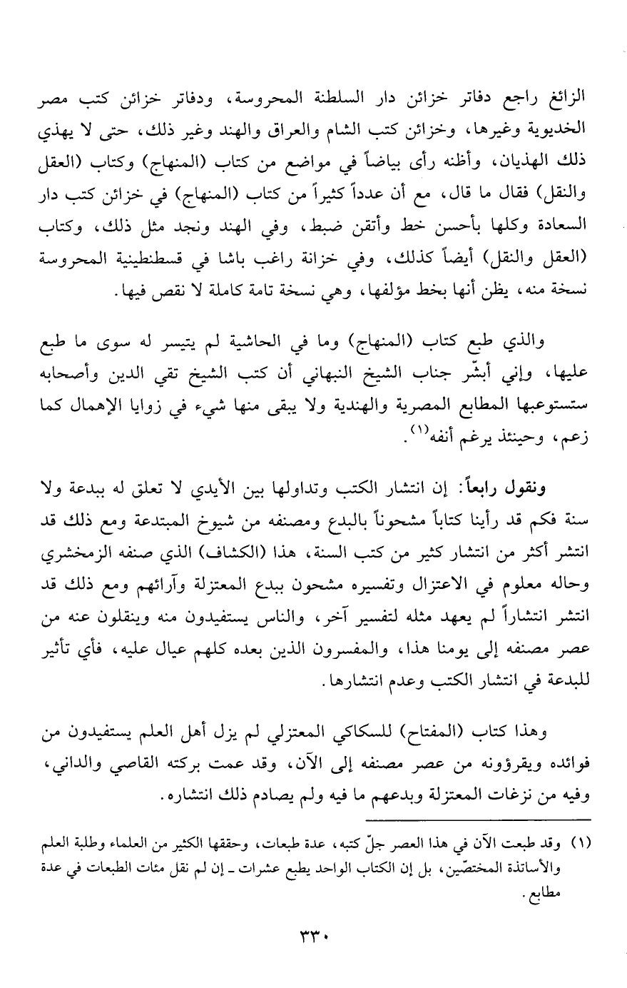 والذي طبع كتاب (المنهاج) وما في الحاشية لم يتيسر له سوى ما طبع عليها، وإني أبشّر جناب الشيخ النبهاني أن كتب الشيخ تقي الدين وأصحابه ستستوعبها المطابع المصرية والهندية ولا يبقى منها شيء في زوايا الإهمال كما زعم، وحينئذ يرغم أنفه1.