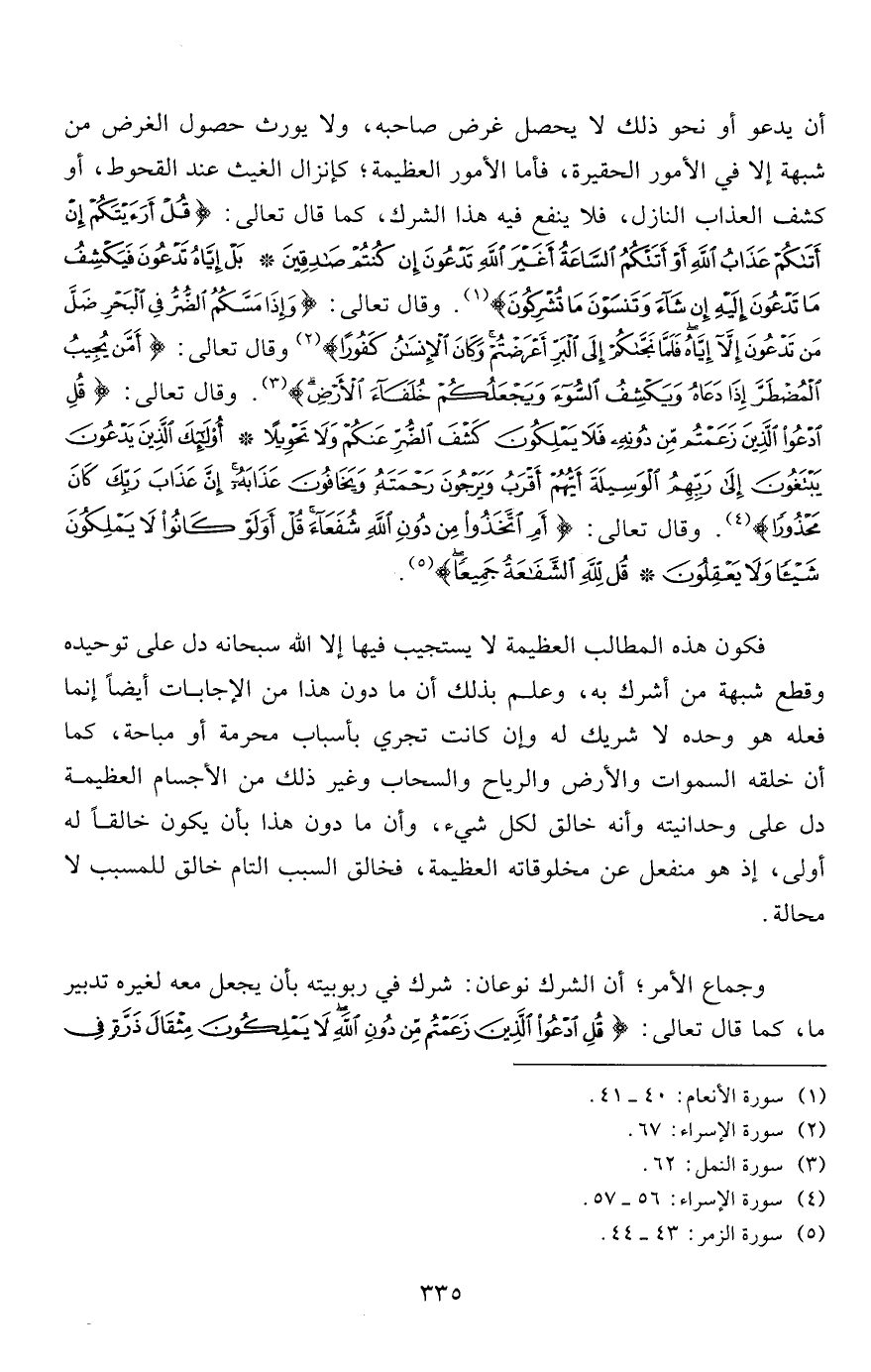 أن يدعو أو نحو ذلك لا يحصل غرض صاحبه، ولا يورث حصول الغرض من شبهة إلا في الأمور الحقيرة، فأما الأمور العظيمة؛ كإنزال الغيث عند القحوط، أو كشف العذاب النازل، فلا ينفع فيه هذا الشرك، كما قال تعالى: {قُلْ أَرَأَيْتَكُمْ إِنْ أَتَاكُمْ عَذَابُ اللَّهِ أَوْ أَتَتْكُمُ السَّاعَةُ أَغَيْرَ اللَّهِ تَدْعُونَ إِنْ كُنْتُمْ صَادِقِينَ * بَلْ إِيَّاهُ تَدْعُونَ فَيَكْشِفُ مَا تَدْعُونَ إِلَيْهِ إِنْ شَاءَ وَتَنْسَوْنَ مَا تُشْرِكُونَ} 1. وقال تعالى: {وَإِذَا مَسَّكُمُ الضُّرُّ فِي الْبَحْرِ ضَلَّ مَنْ تَدْعُونَ إِلَّا إِيَّاهُ فَلَمَّا نَجَّاكُمْ إِلَى الْبَرِّ أَعْرَضْتُمْ وَكَانَ الْأِنْسَانُ كَفُوراً} 2 وقال تعالى: {أَمَّنْ يُجِيبُ الْمُضْطَرَّ إِذَا دَعَاهُ وَيَكْشِفُ السُّوءَ وَيَجْعَلُكُمْ خُلَفَاءَ الْأَرْضِ} 3. وقال تعالى: {قُلِ ادْعُوا الَّذِينَ زَعَمْتُمْ مِنْ دُونِهِ فَلا يَمْلِكُونَ كَشْفَ الضُّرِّ عَنْكُمْ وَلا تَحْوِيلاً * أُولَئِكَ الَّذِينَ يَدْعُونَ يَبْتَغُونَ إِلَى رَبِّهِمُ الْوَسِيلَةَ أَيُّهُمْ أَقْرَبُ وَيَرْجُونَ رَحْمَتَهُ وَيَخَافُونَ عَذَابَهُ إِنَّ عَذَابَ رَبِّكَ كَانَ مَحْذُوراً} 4. وقال تعالى: {أَمِ اتَّخَذُوا مِنْ دُونِ اللَّهِ شُفَعَاءَ قُلْ أَوَلَوْ كَانُوا لا يَمْلِكُونَ شَيْئاً وَلا يَعْقِلُونَ * قُلْ لِلَّهِ الشَّفَاعَةُ جَمِيعاً} 5.