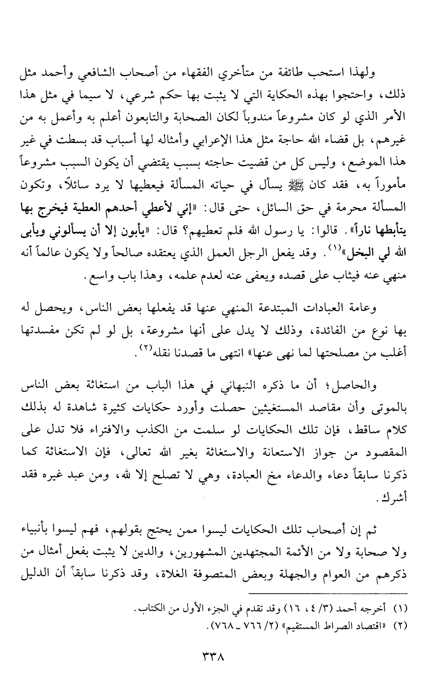 ولهذا استحب طائفة من متأخري الفقهاء من أصحاب الشافعي وأحمد مثل ذلك، واحتجوا بهذه الحكاية التي لا يثبت بها حكم شرعي، لاسيما في مثل هذا الأمر الذي لو كان مشروعاً مندوباً لكان الصحابة والتابعون أعلم به وأعمل به من غيرهم، بل قضاء الله حاجة مثل هذا الإعرابي وأمثاله لها أسباب قد بسطت في غير هذا الموضع، وليس كل من قضيت حاجته بسبب يقتضي أن يكون السبب مشروعاً مأموراً به، فقد كان صلى الله عليه وسلم يسأل في حياته المسألة فيعطيها لا يرد سائلاً، وتكون المسألة محرمة في حق السائل، حتى قال: "إني لأعطي أحدهم العطية فيخرج بها يتأبطها ناراً". قالوا: يا رسول الله فلم تعطيهم؟ قال: "يأبون إلا أن يسألوني ويأبى الله لي البخل"1. وقد يفعل الرجل العمل الذي يعتقده صالحاً ولا يكون عالماً أنه منهي عنه فيثاب على قصده ويعفى عنه لعدم علمه، وهذا باب واسع.