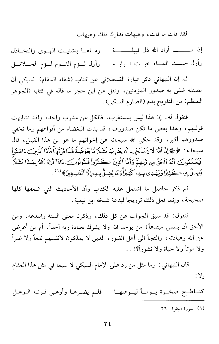 ثم إن النبهاني ذكر عبارة القسطلاني عن كتاب "شفاء السقام" للسبكي أن مصنفه شفى به صدور المؤمنين، ونقل عن ابن حجر ما قاله في كتابه "الجوهر المنظم" من التلويح بذم "الصارم المنكي".