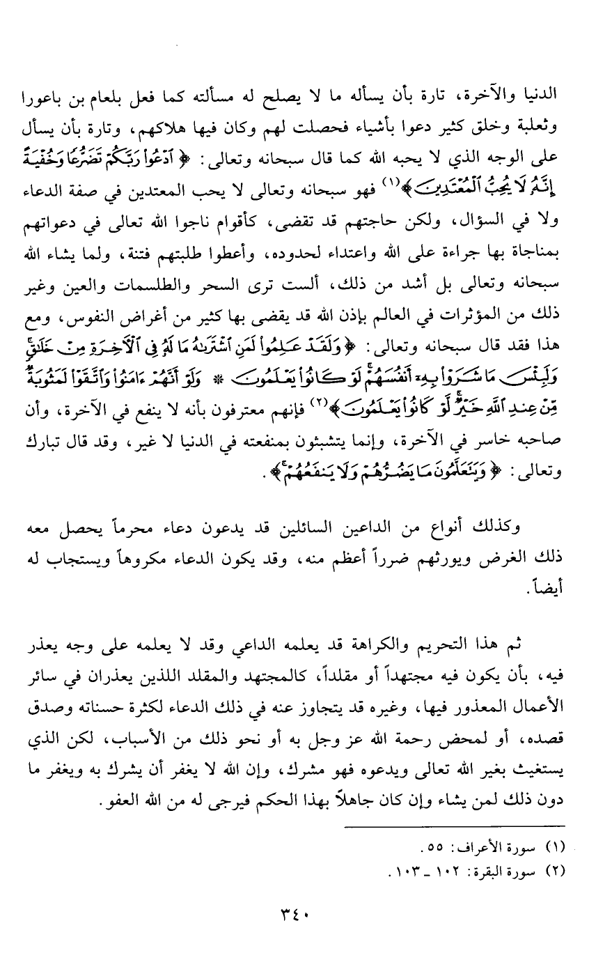 الدنيا والآخرة، تارة بأن يسأله ما لا يصلح له مسألته كما فعل بلعام بن باعورا وثعلبة وخلق كثير دعوا بأشياء فحصلت لهم وكان فيها هلاكهم، وتارة بأن يسأل على الوجه الذي لا يحبه الله كما قال سبحانه وتعالى: {ادْعُوا رَبَّكُمْ تَضَرُّعاً وَخُفْيَةً إِنَّهُ لا يُحِبُّ الْمُعْتَدِينَ} 1 فهو سبحانه وتعالى لا يحب المعتدين في صفة الدعاء ولا في السؤال، ولكن حاجتهم قد تقضى، كأقوام ناجوا الله تعالى في دعواتهم بمناجاة بها جراءة على الله واعتداء لحدوده، وأعطوا طلبتهم فتنة، ولما يشاء الله سبحانه وتعالى بل أشد من ذلك، ألست ترى السحر والطلسمات والعين وغير ذلك من المؤثرات في العالم بإذن الله قد يقضى بها كثير من أغراض النفوس، ومع هذا فقد قال سبحانه وتعالى: {وَلَقَدْ عَلِمُوا لَمَنِ اشْتَرَاهُ مَا لَهُ فِي الْآخِرَةِ مِنْ خَلاقٍ وَلَبِئْسَ مَا شَرَوْا بِهِ أَنْفُسَهُمْ لَوْ كَانُوا يَعْلَمُونَ * وَلَوْ أَنَّهُمْ آمَنُوا وَاتَّقَوْا لَمَثُوبَةٌ مِنْ عِنْدِ اللَّهِ خَيْرٌ لَوْ كَانُوا يَعْلَمُونَ} 2 فإنهم معترفون بأنه لا ينفع في الآخرة، وأن صاحبه خاسر في الآخرة، وإنما يتشبثون بمنفعته في الدنيا لا غير، وقد قال تبارك وتعالى: {وَيَتَعَلَّمُونَ مَا يَضُرُّهُمْ وَلا يَنْفَعُهُمْ} .