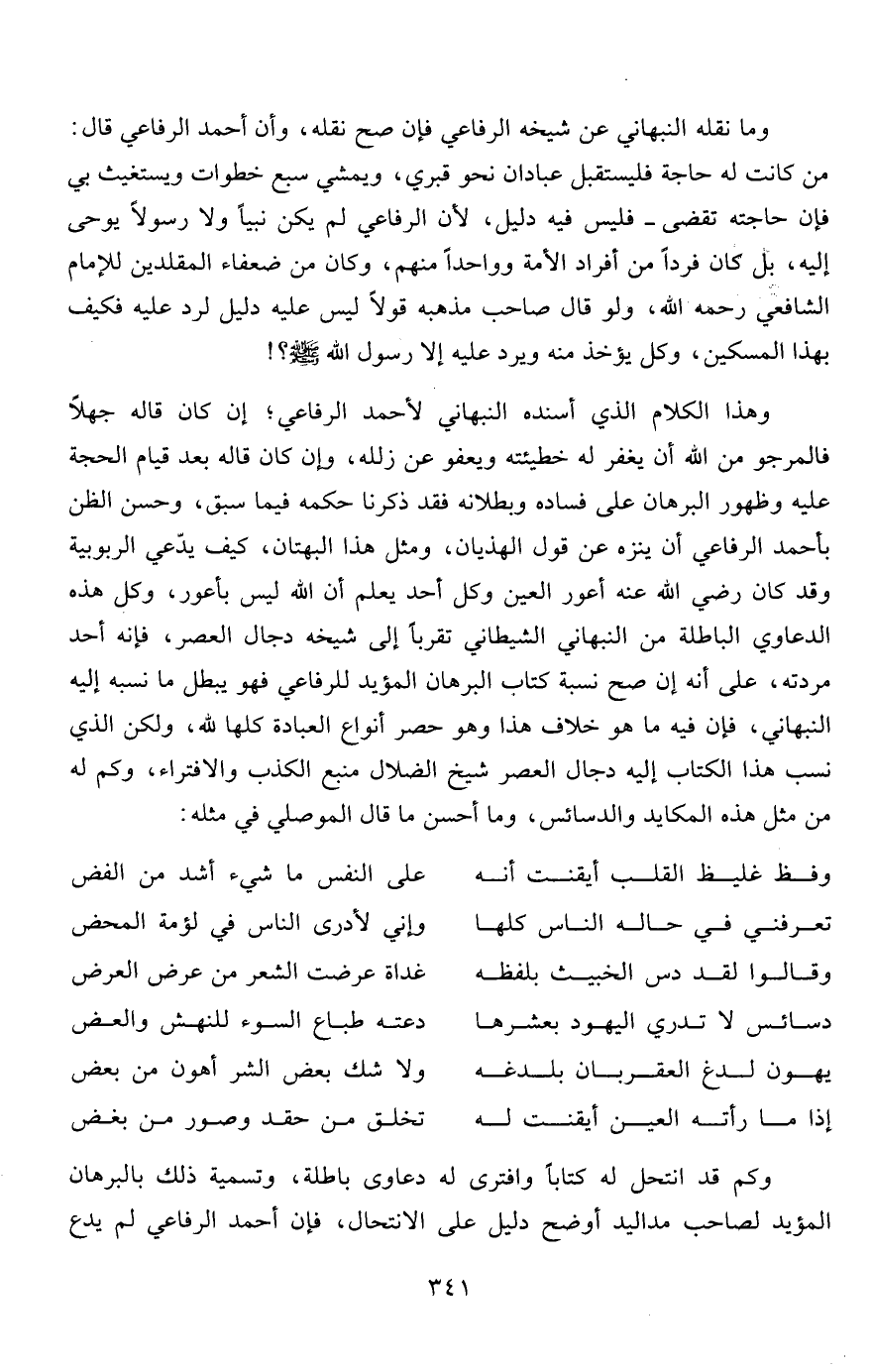 وهذا الكلام الذي أسنده النبهاني لأحمد الرفاعي؛ إن كان قاله جهلاً فالمرجو من الله أن يغفر له خطيئته ويعفو عن زلله، وإن كان قاله بعد قيام الحجة عليه وظهور البرهان على فساده وبطلانه فقد ذكرنا حكمه فيما سبق، وحسن الظن بأحمد الرفاعي أن ينزه عن قول الهذيان، ومثل هذا البهتان، كيف يدّعي الربوبية وقد كان رضي الله عنه أعور العين وكل أحد يعلم أن الله ليس بأعور، وكل هذه الدعاوي الباطلة من النبهاني الشيطاني تقرباً إلى شيخه دجال العصر، فإنه أحد مردته، على أنه إن صح نسبة كتاب البرهان المؤيد للرفاعي فهو يبطل ما نسبه إليه النبهاني، فإن فيه ما هو خلاف هذا وهو حصر أنواع العبادة كلها لله، ولكن الذي نسب هذا الكتاب إليه دجال العصر شيخ الضلال منبع الكذب والافتراء، وكم له من مثل هذه المكايد والدسائس، وما أحسن ما قال الموصلي في مثله: