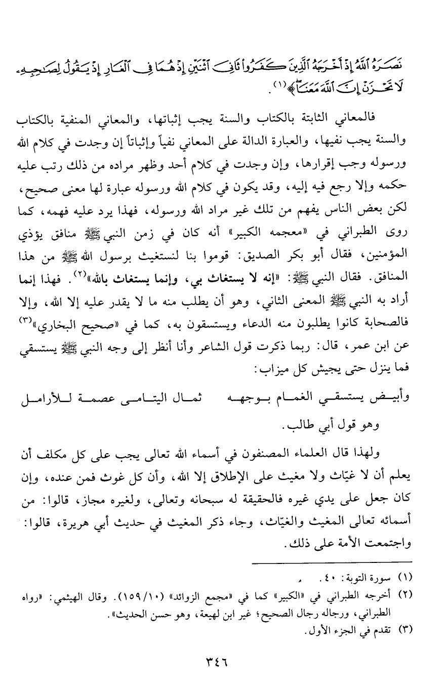 فالمعاني الثابتة بالكتاب والسنة يجب إثباتها، والمعاني المنفية بالكتاب والسنة يجب نفيها، والعبارة الدالة على المعاني نفياً وإثباتاً إن وجدت في كلام الله ورسوله وجب إقرارها، وإن وجدت في كلام أحد وظهر مراده من ذلك رتب عليه حكمه وإلا رجع فيه إليه، وقد يكون في كلام الله ورسوله عبارة لها معنى صحيح، لكن بعض الناس يفهم من تلك غير مراد الله ورسوله، فهذا يرد عليه فهمه، كما روى الطبراني في "معجمه الكبير" أنه كان في زمن النبي صلى الله عليه وسلم منافق يؤذي المؤمنين، فقال أبو بكر الصديق: قوموا بنا لنستغيث برسول الله صلى الله عليه وسلم من هذا المنافق. فقال النبي صلى الله عليه وسلم: "إنه لا يستغاث بي، وإنما يستغاث بالله"2. فهذا إنما أراد به النبي صلى الله عليه وسلم المعنى الثاني، وهو أن يطلب منه ما لا يقدر عليه إلا الله، وإلا فالصحابة كانوا يطلبون منه الدعاء ويستسقون به، كما في "صحيح البخاري"3 عن ابن عمر، قال: ربما ذكرت قول الشاعر وأنا أنظر إلى وجه النبي صلى الله عليه وسلم يستسقي فما ينزل حتى يجيش كل ميزاب: