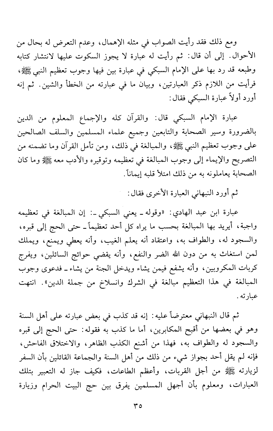 ومع ذلك فقد رأيت الصواب في مثله. الإهمال، وعدم التعرض له بحال من الأحوال. إلى أن قال: ثم رأيت له عبارة لا يجوز السكوت عليها لانتشار كتابه وطبعه قد رد بها على الإمام السبكي في عبارة بين فيها وجوب تعظيم النبي صلى الله عليه وسلم، فرأيت من اللازم ذكر العبارتين، وبيان ما في عبارته من الخطأ والشين. ثم إنه أورد أولاً عبارة السبكي فقال: