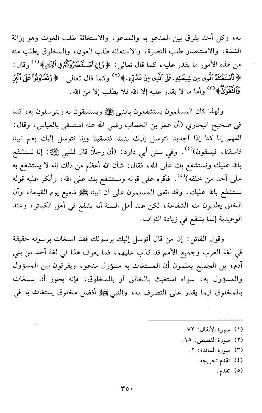 وقول القائل: إن من قال أتوسل إليك برسولك فقد استغاث برسوله حقيقة في لغة العرب وجميع الأمم قد كذب عليهم، فما يعرف هذا في لغة أحد من بني آدم، بل الجميع يعلمون أن المستغاث به مسؤول مدعو، ويفرقون بين المسؤول والمسؤول به، سواء استغيث بالخالق أو بالمخلوق، فإنه يجوز أن يستغاث بالمخلوق فيما يقدر على التصرف به، والنبي صلى الله عليه وسلم أفضل مخلوق يستغاث به في