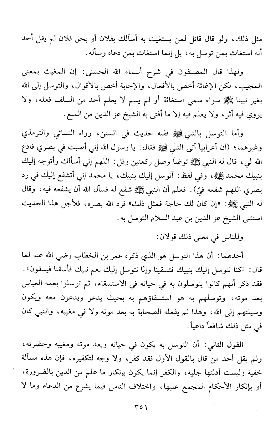 وأما التوسل بالنبي صلى الله عليه وسلم ففيه حديث في السنن، رواه النسائي والترمذي وغيرهما؛ "أن أعرابياً أتى النبي صلى الله عليه وسلم فقال: يا رسول الله إني أصبت في بصري فادع الله لي، قال له النبي صلى الله عليه وسلم توضأ وصل ركعتين وقل: اللهم إني أسألك وأتوجه إليك بنبيك محمد صلى الله عليه وسلم، وفي لفظ: أتوسل إليك بنبيك، يا محمد إني أتشفع إليك في رد بصري اللهم شفعه فيّ". فعلم أن النبي صلى الله عليه وسلم شفع له فسأل الله أن يشفعه فيه، وقال له النبي صلى الله عليه وسلم: "إن كان لك حاجة فمثل ذلك" فرد الله بصره، فلأجل هذا الحديث استثنى الشيخ عز الدين بن عبد السلام التوسل به.