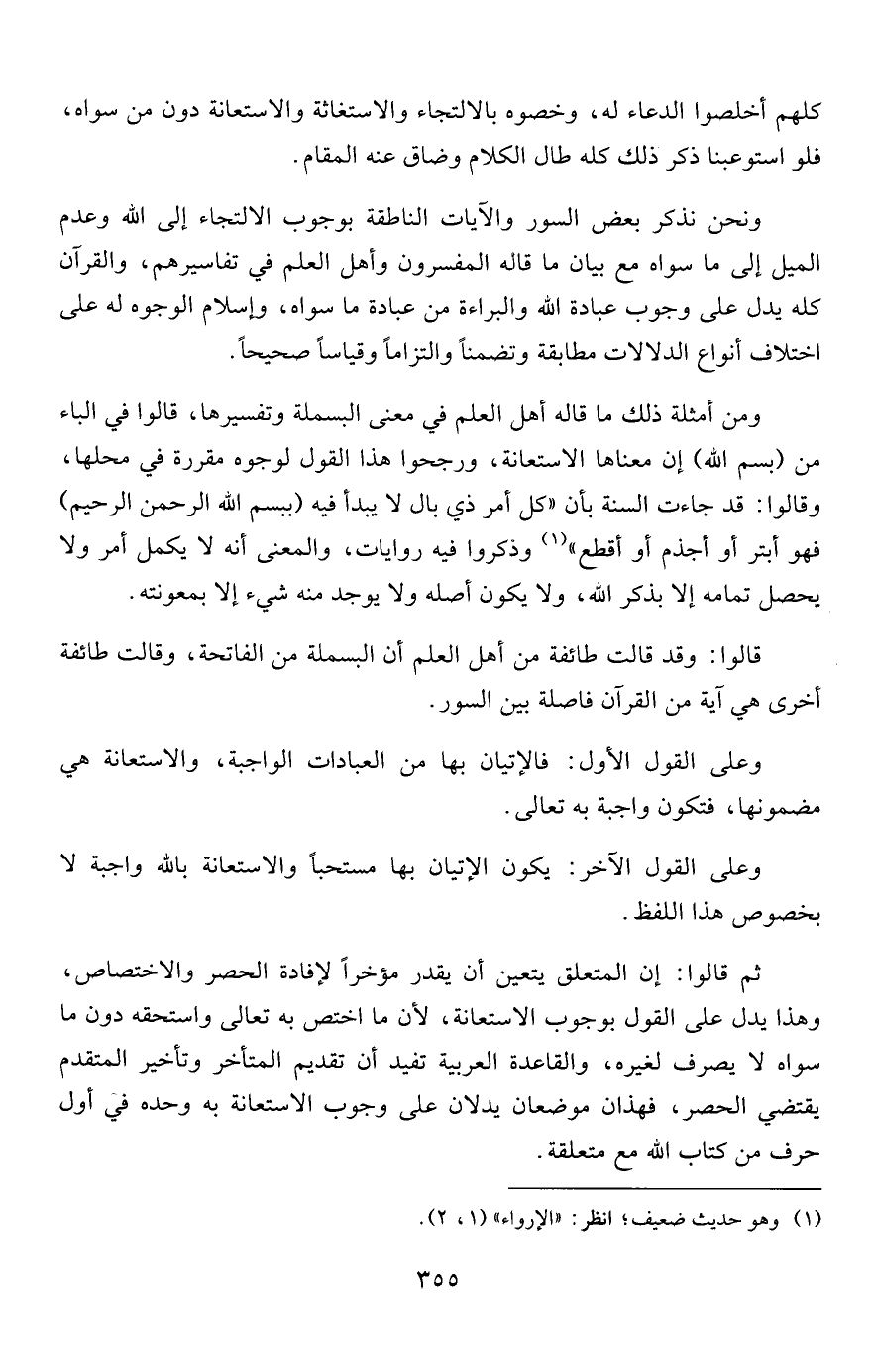 ثم قالوا: إن المتعلق يتعين أن يقدر مؤخراً لإفادة الحصر والاختصاص، وهذا يدل على القول بوجوب الاستعانة، لأن ما اختص به تعالى واستحقه دون ما سواه لا يصرف لغيره، والقاعدة العربية تفيد أن تقديم المتأخر وتأخير المتقدم يقتضي الحصر، فهذان موضعان يدلان على وجوب الاستعانة به وحده في أول حرف من كتاب الله مع متعلقة.