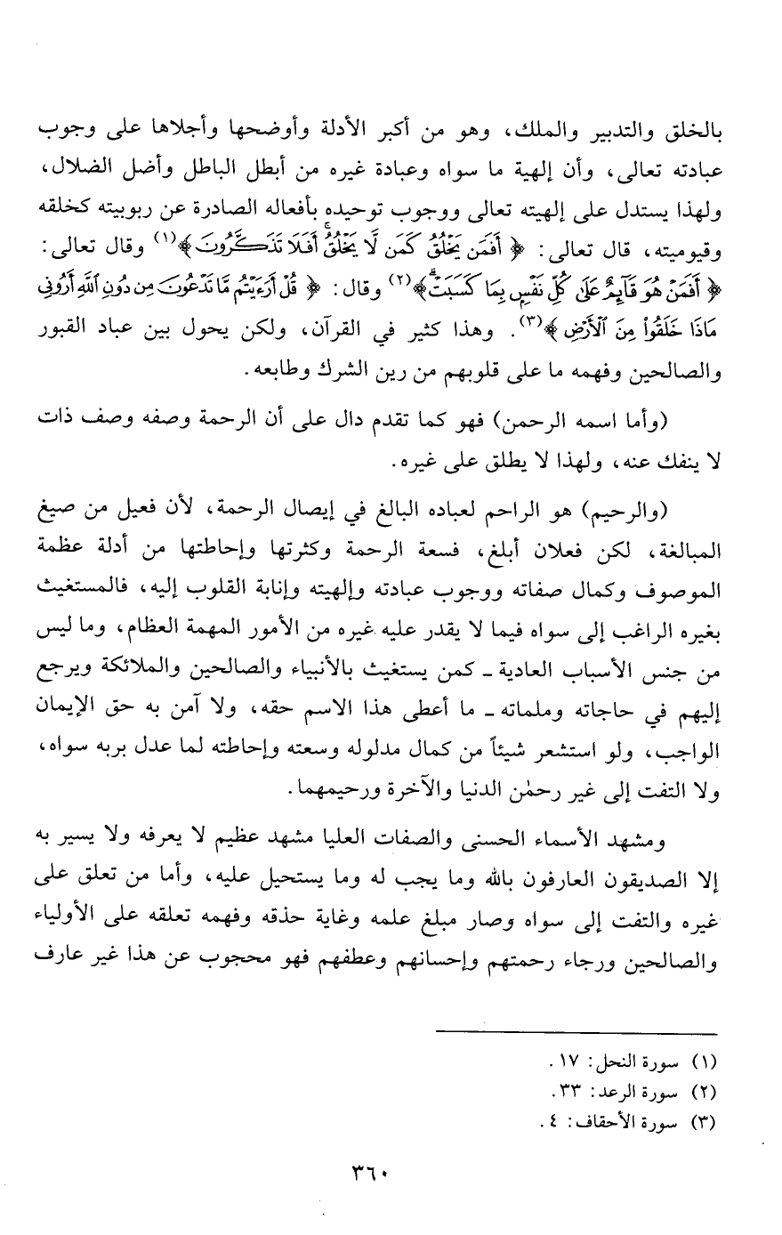 بالخلق والتدبير والملك، وهو من أكبر الأدلة وأوضحها وأجلاها على وجوب عبادته تعالى، وأن إلهية ما سواه وعبادة غيره من أبطل الباطل وأضل الضلال، ولهذا يستدل على إلهيته تعالى ووجوب توحيد بأفعاله الصادرة عن ربوبيته كخلقه وقيوميته، قال تعالى: {أَفَمَنْ يَخْلُقُ كَمَنْ لا يَخْلُقُ أَفَلا تَذَكَّرُونَ} 1 وقال تعالى: {أَفَمَنْ هُوَ قَائِمٌ عَلَى كُلِّ نَفْسٍ بِمَا كَسَبَتْ} 2 وقال: {قُلْ أَرَأَيْتُمْ مَا تَدْعُونَ مِنْ دُونِ اللَّهِ أَرُونِي مَاذَا خَلَقُوا مِنَ الْأَرْضِ} 3. وهذا كثير في القرآن، ولكن يحول بين عباد القبور والصالحين وفهمه ما على قلوبهم من رين الشرك وطابعه.
