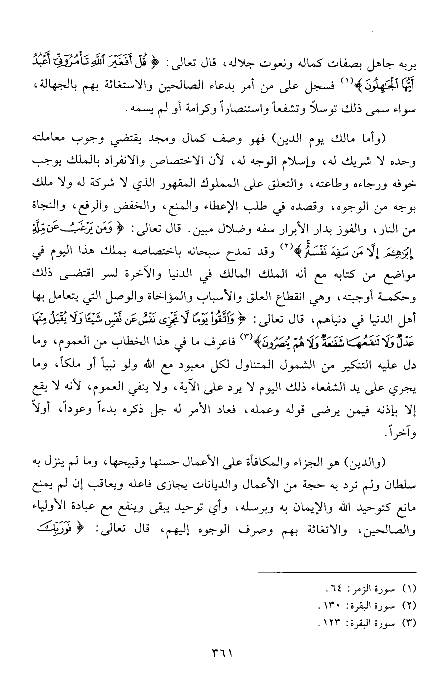 (وأما مالك يوم الدين) فهو وصف كمال ومجد يقتضي وجوب معاملته وحده لا شريك له، وإسلام الوجه له، لأن الاختصاص والانفراد بالملك يوجب خوفه ورجاءه وطاعته، والتعلق على المملوك المقهور الذي لا شركة له ولا ملك بوجه من الوجوه، وقصده في طلب الإعطاء والمنع، والخفض والرفع، والنجاة من النار، والفوز بدار الأبرار سفه وضلال مبين. قال تعالى: {وَمَنْ يَرْغَبُ عَنْ مِلَّةِ إِبْرَاهِيمَ إِلَّا مَنْ سَفِهَ نَفْسَهُ} 2 وقد تمدح سبحانه باختصاصه بملك هذا اليوم في مواضع من كتابه مع أنه الملك المالك في الدنيا والآخرة لسر اقتضى ذلك وحكمة أوجبته، وهي انقطاع العلق والأسباب والمؤاخاة والوصل التي يتعامل بها أهل الدنيا في دنياهم، قال تعالى: {وَاتَّقُوا يَوْماً لا تَجْزِي نَفْسٌ عَنْ نَفْسٍ شَيْئاً وَلا يُقْبَلُ مِنْهَا عَدْلٌ وَلا تَنْفَعُهَا شَفَاعَةٌ وَلا هُمْ يُنْصَرُونَ} 3 فاعرف ما في هذا الخطاب من العموم، وما دل عليه التنكير من الشمول المتناول لكل معبود مع الله ولو نبياً أو ملكاً، وما يجري على يد الشفعاء ذلك اليوم لا يرد على الآية، ولا ينفي العموم، لأنه لا يقع إلا بإذنه فيمن يرضى قوله وعمله، فعاد الأمر له جل ذكره بدءاً وعوداً، أولاً وآخراً.