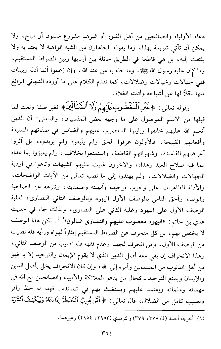 وقوله تعالى: {غَيْرِ الْمَغْضُوبِ عَلَيْهِمْ وَلا الضَّالِّينَ} فغير صفة ونعت لما قبلها من الاسم الموصول على ما وجهه بعض المفسيرن، والمعنى: أن الذين أنعم الله عليهم خالفوا وباينوا المغضوب عليهم والضالين في صفاتهم الشنيعة وأفعالهم القبيحة، فالأولون عرفوا الحق ولم يتبعوه ولم يريدوه، بل آثروا أغراضهم الفاسدة، وشهواتهم القاطعة، واستمتعوا بخلاقهم، ولم يعبؤوا بما عداه مما فيه صلاح العبد وهداه، والآخرون غلبت عليهم الشبهات وتاهوا في أودية الجهالات والضلالات، ولم يهتدوا إلى ما نصبه تعالى من الآيات الواضحات، والأدلة الظاهرات على وجوب توحيده وآلهيته وصمديته، وتنزهه عن الصاحبة والولد، وأحق الناس بالوصف الأول اليهود وبالوصف الثاني النصاري، لغلبة الوصف الأول على اليهود وغلبة الثاني على النصارى، ولذلك جاء في حديث عدي بن حاتم: "اليهود مغضوب عليهم والنصارى ضالون"1. لكن هذا الوصف لا يختص بهم، بل كل منحرف عن الصراط المستقيم إيثاراً لهواه ورأيه فله نصيب من الوصف الأول، ومن انحرف لجهله وعدم فقهه فله نصيب من الوصف الثاني، وهذا الانحراف إن بقي معه أصل الدين الذي لا يقوم الإيمان والتوحيد إلا به فهو من أهل الذنوب من المسلمين وأمره إلى الله، وإن كان الانحراف يخل بأصل الدين والإيمان ويمنع التوحيد- كحال من يدعو الملائكة والأنبياء والصالحين مع الله في مهماته وملماته ويعتمد عليهم ويستغيث بهم في شدائده- فهذا له حظ وافر ونصيب كامل من الضلال، قال تعالى: {أَمَّنْ يُجِيبُ الْمُضْطَرَّ إِذَا دَعَاهُ وَيَكْشِفُ السُّوءَ