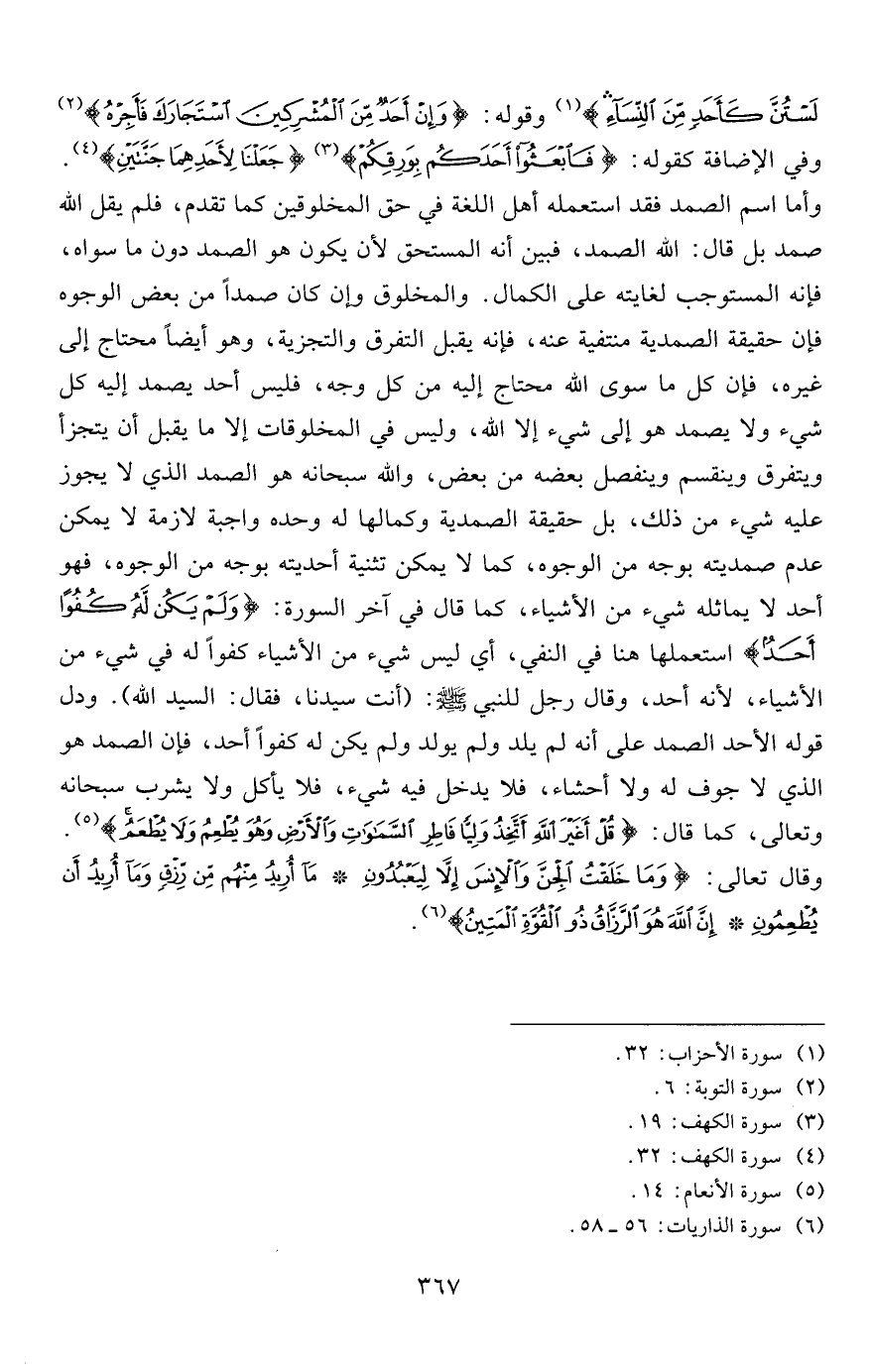 لَسْتُنَّ كَأَحَدٍ مِنَ النِّسَاءِ} 1 وقوله: {وَإِنْ أَحَدٌ مِنَ الْمُشْرِكِينَ اسْتَجَارَكَ فَأَجِرْهُ} 2 وفي الإضافة كقوله: {فَابْعَثُوا أَحَدَكُمْ بِوَرِقِكُمْ} 3 {جَعَلْنَا لِأَحَدِهِمَا جَنَّتَيْنِ} 4. وأما اسم الصمد فقد استعمله أهل اللغة في حق المخلوقين كما تقدم، فلم يقل الله صمد بل قال: الله الصمد، فبين أنه المستحق لأن يكون هو الصمد دون ما سواه، فإنه المستوجب لغايته على الكمال. والمخلوق هان كان صمدا من بعض الوجوه فإن حقيقة الصمدية منتفية عنه، فإنه يقبل التفرق والتجزية، وهو أيضاً محتاج إلى غيره، فإن كل ما سوها الله محتاج إليه من كل وجه، فليس أحد يصمد إليه كل شيء ولا يصمد هو إلى شيء إلا الله، وليمس في المخلوقات إلا ما يقبل أن يتجزأ ويتفرق وينقسم وينفصل بعضه من بعض، والله سبحانه هو الصمد الذي لا يجوز عليه شيء من ذلك، بل حقيقة الصمدية وكمالها له وحده واجبة لازمة لا يمكن عدم صمديته بوجه من الوجوه، كما لا يمكن تثنية أحديته بوجه من الوجوه، فهو أحد لا يماثله شيء من الأشياء، كما قال في آخر السورة: {وَلَمْ يَكُنْ لَهُ كُفُواً أَحَدٌ} استعملها هنا في النفي، أي ليس شيء من الأشياء كفوا له في شيء من الأشياء، لأنه أحد، وقال رجل للنبي صلى الله عليه وسلم: (أنت سيدنا، فقال: السيد الله) . ودل قوله الأحد الصمد على أنه لم يلد ولم يولد ولم يكن له كفوا أحد، فإن الصمد هو الذي لا جوف له ولا أحشاء، فلا يدخل فيه شيء، فلا يأكل ولا يشرب سبحانه وتعالى، كما قال: {قُلْ أَغَيْرَ اللَّهِ أَتَّخِذُ وَلِيّاً فَاطِرِ السَّمَاوَاتِ وَالْأَرْضِ وَهُوَ يُطْعِمُ وَلا يُطْعَمُ} 5. وقال تعالى: {وَمَا خَلَقْتُ الْجِنَّ وَالْأِنْسَ إِلَّا لِيَعْبُدُونِ * مَا أُرِيدُ مِنْهُمْ مِنْ رِزْقٍ وَمَا أُرِيدُ أَنْ يُطْعِمُونِ} 6.