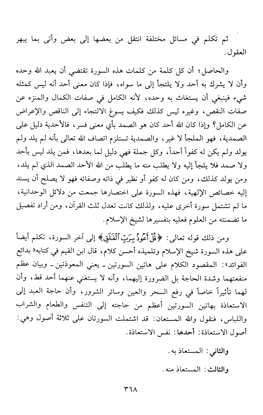 ومن ذلك قوله تعالى: {قُلْ أَعُوذُ بِرَبِّ الْفَلَقِ} إلى آخر السورة، تكلم أيضاً على هذه السورة شيخ الإسلام وتلميذه أحسن كلام، قال ابن القيم في كتابه "بدائع الفوائد": المقصود الكلام على هاتين السورتين- يعني المعوذتين- وبيان عظم منفعتهما وشدة الحاجة بل الضرورة إليهما، وأنه لا يستغني عنهما أحد قط، وأن لهما تأثيراً خاصاً في رفع السحر والعين وسائر الشرور، وأن حاجة العبد إلى الاستعاذة بهاتين السورتين أعظم من حاجته إلى التنفس والطعام والشراب واللباس، فنقول والله المستعان: قد اشتملت السورتان على ثلاثة أصول وهي: أصول الاستعاذة: أحدها: نفس الاستعاذة.
