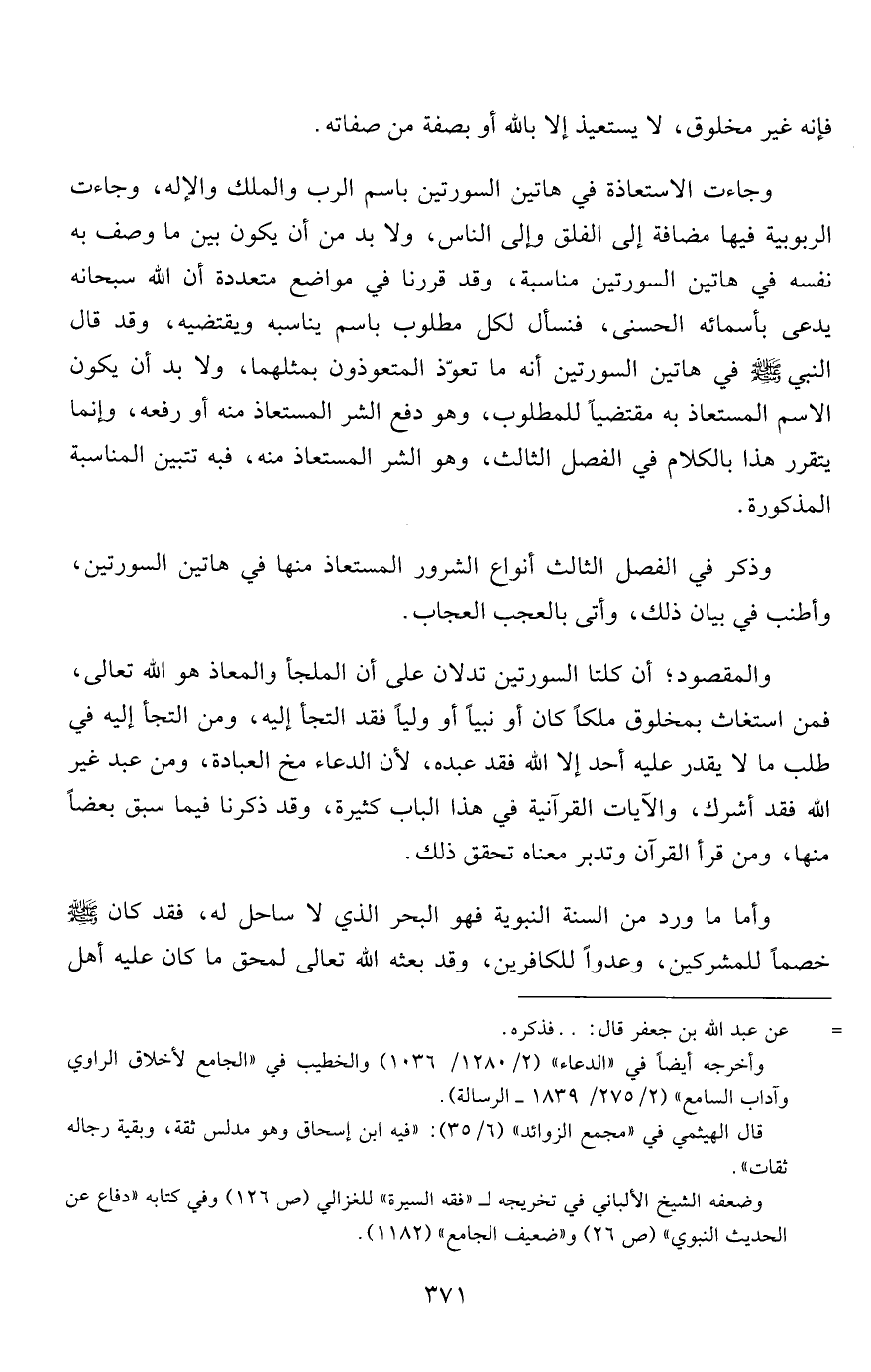 والمقصود؛ أن كلتا السورتين تدلان على أن الملجأ والمعاذ هو الله تعالى، فمن استغاث بمخلوق ملكاً كان أو نبياً أو ولياً فقد التجأ إليه، ومن التجأ إليه في طلب ما لا يقدر عليه أحد إلا الله فقد عبده، لأن الدعاء مخ العبادة، ومن عبد غير الله فقد أشرك، والآيات القرآنية في هذا الباب كثيرة، وقد ذكرنا فيما سبق بعضاً منها، ومن قرأ القرآن وتدبر معناه تحقق ذلك.