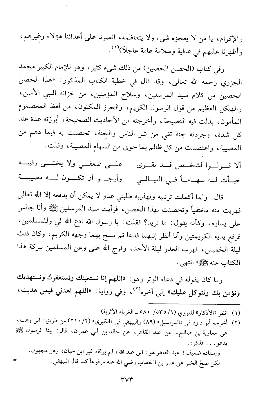 وفي كتاب (الحصن الحصين) من ذلك شيء كثير، وهو للإمام الكبير محمد الجزري رحمه الله تعالى، وقد قال في خطبة الكتاب المذكور: "هذا الحصن الحصين من كلام سيد المرسلين، وسلاح المؤمنين، من خزانة النبي الأمين، والهيكل العظيم من قول الرسول الكريم، والحرز المكنون، من لفظ المعصوم المأمون، بذلت فيه النصيحة، وأخرجته من الأحاديث الصحيحة، أبرزته عدة عند كل شدة، وجردته جنة تقي من شر الناس والجنة، تحصنت به فيما دهم من المصيبة، واعتصمت من كل ظالم بما حوى من السهام المصيبة، وقلت: