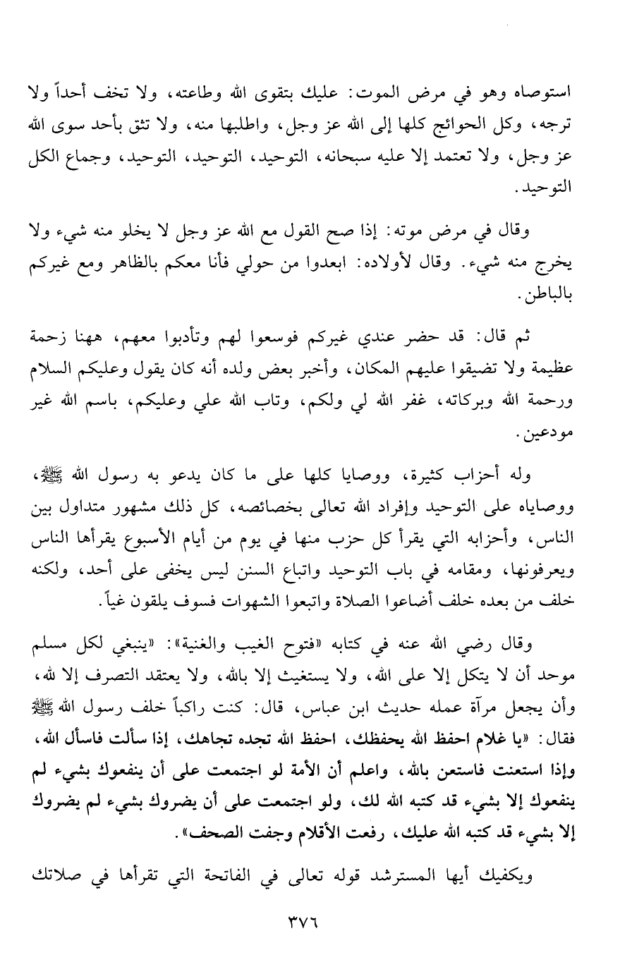 وقال رضي الله عنه في كتابه "فتوح الغيب والغنية": "ينبغي لكل مسلم موحد أن لا يتكل إلا على الله، ولا يستغيث إلا بالله، ولا يعتقد التصرف إلا لله، وأن يجعل مرآة عمله حديث ابن عباس، قال: كنت راكباً خلف رسول الله صلى الله عليه وسلم فقال: "يا غلام احفظ الله يحفظك، احفظ الله تجده تجاهك، إذا سألت فاسأل الله، وإذا استعنت فاستعن بالله، واعلم أن الأمة لو اجتمعت على أن ينفعوك بشيء لم ينفعوك إلا بشيء قد كتبه الله لك، ولو اجتمعت على أن يضروك بشيء لم يضروك إلا بشيء قد كتبه الله عليك، رفعت الأقلام وجفت الصحف".