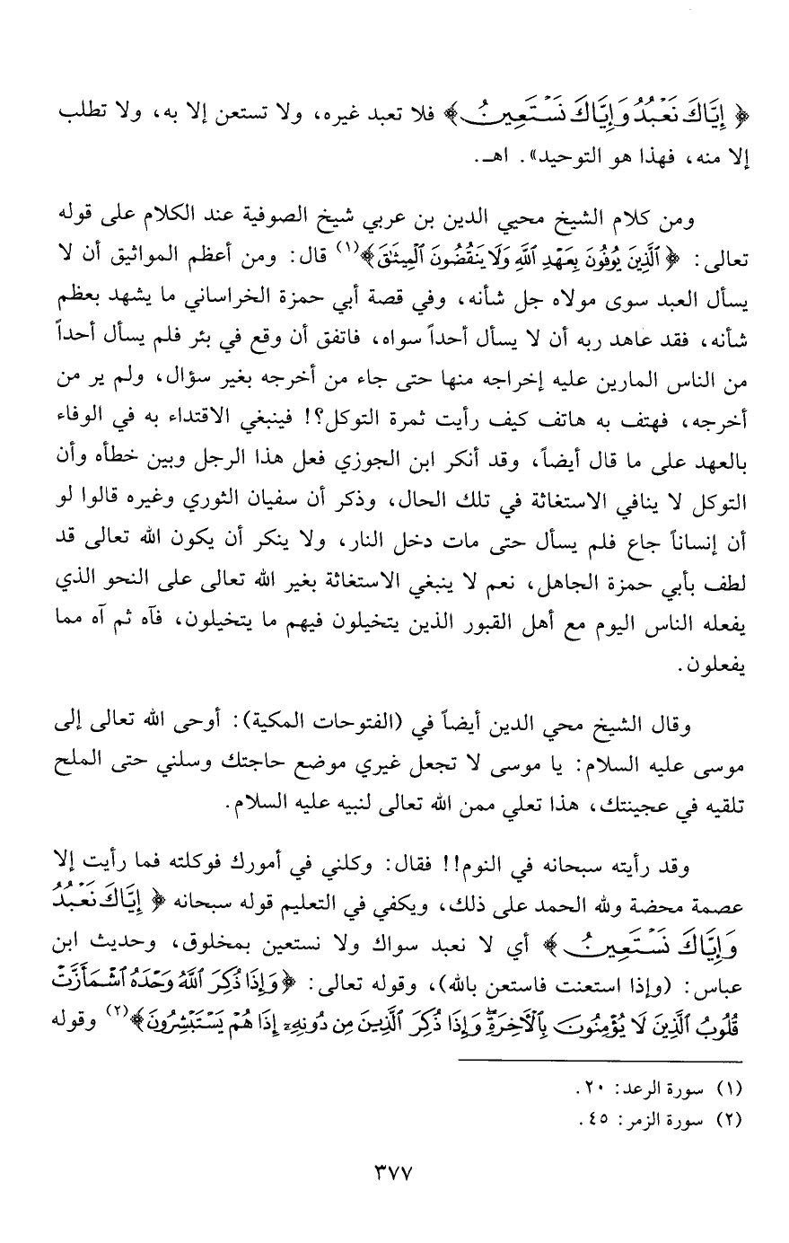 وقد رأيته سبحانه في النوم!! فقال: وكلني في أمورك فوكلته فما رإيت إلا عصمة محضة ولله الحمد على ذلك، ويكفي في التعليم قوله سبحانه {إِيَّاكَ نَعْبُدُ وَإِيَّاكَ نَسْتَعِينُ} أي لا نعبد سواك ولا نستعين بمخلوق، وحديث ابن عباس: "وإذا استعنت فاستعن بالله"، وقوله تعالى: {وَإِذَا ذُكِرَ اللَّهُ وَحْدَهُ اشْمَأَزَّتْ قُلُوبُ الَّذِينَ لا يُؤْمِنُونَ بِالْآخِرَةِ وَإِذَا ذُكِرَ الَّذِينَ مِنْ دُونِهِ إِذَا هُمْ يَسْتَبْشِرُونَ} 2 وقوله