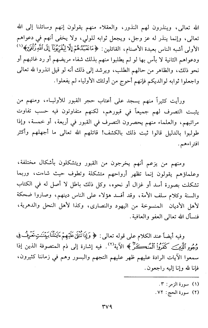 وفيه أيضاً عند الكلام على قوله تعالى: {وَإِذَا تُتْلَى عَلَيْهِمْ آيَاتُنَا بَيِّنَاتٍ تَعْرِفُ فِي وُجُوهِ الَّذِينَ كَفَرُوا الْمُنْكَرَ} الآية2. فيه إشارة إلى ذم المتصوفة الذين إذا سمعوا الآيات الرادة عليهم ظهر عليهم التجهم والبسور وهم في زماننا كثيرون، فإنا لله وإنا إليه راجعون.