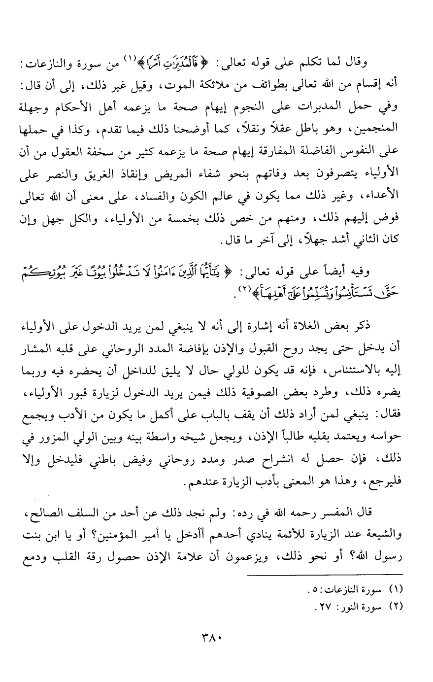قال المفسر رحمه الله في رده: ولم نجد ذلك عن أحد من السلف الصالح، والشيعة عند الزيارة للأئمة ينادي أحدهم أأدخل يا أمير المؤمنين؟ أو يا ابن بنت رسول الله؟ أو نحو ذلك، ويزعمون أن علامة الإذن حصول رقة القلب ودمع