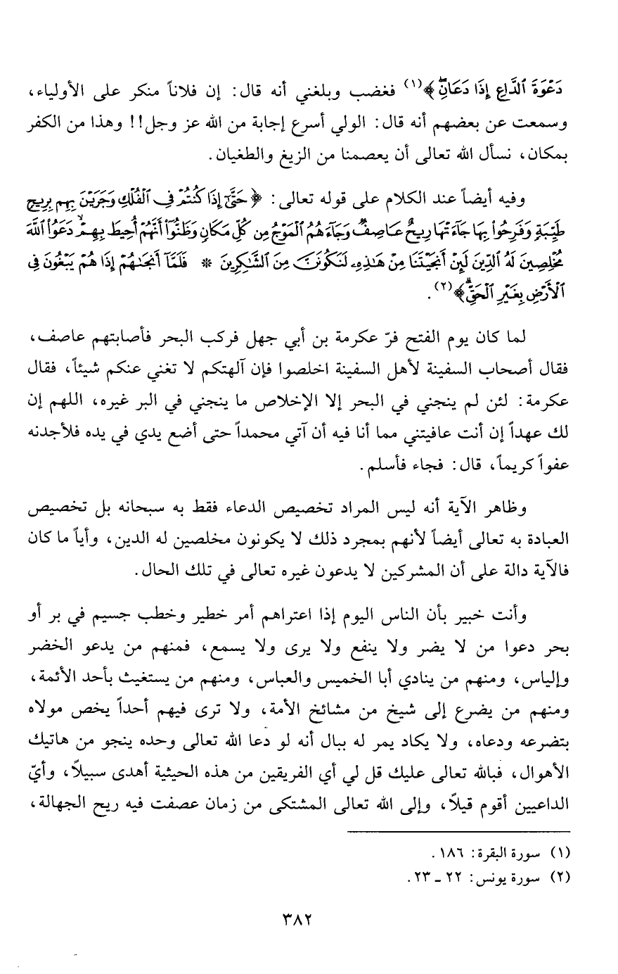 وأنت خبير بأن الناس اليوم إذا اعتراهم أمر خطير وخطب جسيم في بر أو بحر دعوا من لا يضر ولا ينفع ولا يرى ولا يسمع، فمنهم من يدعو الخضر وإلياس، ومنهم من ينادي أبا الخميس والعباس، ومنهم من يستغيث بأحد الأئمة، ومنهم من يضرع إلى شيخ من مشائخ الأمة، ولا ترى فيهم أحداً يخص مولاه بتضرعه ودعاه، ولا يكاد يمر له ببال أنه لو دعا الله تعالى وحده ينجو من هاتيك الأهوال، فبالله تعالى عليك قل لي أي الفريقين من هذه الحيثية أهدى سبيلاً، وأي الداعيين أقوم قيلاً، وإلى الله تعالى المشتكى من زمان عصفت فيه ريح الجهالة،