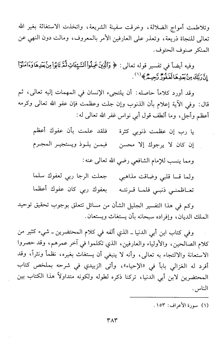 وفي كتاب ابن أبي الدنيا- الذي ألفه في كلام المحتضرين- شيء كثير من كلام الصالحين، والأولياء والعارفين، الذي تكلموا في آخر عمرهم، وقدس حصروا الاستعانة والالتجاء به تعالى، وأنه لا ينبغي أن يستغاث بغيره، نظماً ونثراً، وقد أفرد له الغزالي باباً في "الإحياء"، وأتى الزبيدي في شرحه بملخص كتاب المحتضرين لابن أبي الدنيا، تركنا ذكره لطوله ولكونه متداولاً هذا الكتاب بين الناس.