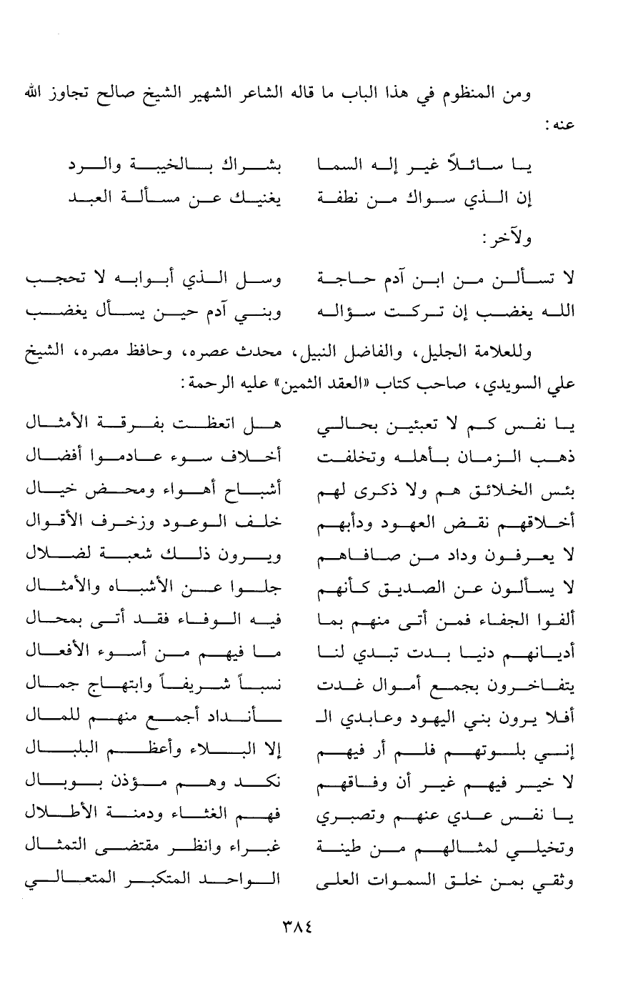 وللعلامة الجليل، والفاضل النبيل، محدث عصره، وحافظ مصره، الشيخ علي السويدي، صاحب كتاب "العقد الثمين" عليه الرحمة: