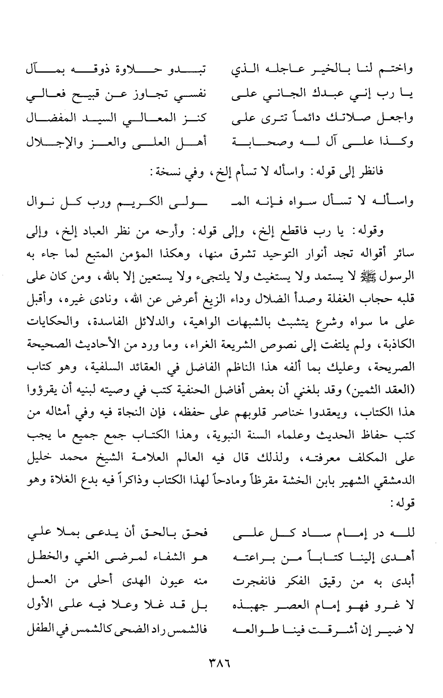 وقوله: يا رب فاقطع إلخ، وإلى قوله: وأرحه من نظر العباد إلخ، وإلى سائر أقواله تجد أنوار التوحيد تشرق منها، وهكذا المؤمن المتبع لما جاء به الرسول صلى الله عليه وسلم لا يستمد ولا يستغيث ولا يلتجىء ولا يستعين إلا بالله، ومن كان على قلبه حجاب الغفلة وصدأ الضلال وداء الزيغ أعرض عن الله، ونادى غيره، وأقبل على ما سواه وشرع يتشبث بالشبهات الواهية، والدلائل الفاسدة، والحكايات الكاذبة، ولم يلتفت إلى نصوص الشريعة الغراء، وما ورد من الأحاديث الصحيحة الصريحة، وعليك بما ألفه هذا الناظم الفاضل في العقائد السلفية، وهو كتاب (العقد الثمين) وقد بلغني أن بعض أفاضل الحنفية كتب في وصيته لبنيه أن يقرؤوا هذا الكتاب، ويعقدوا خناصر قلوبهم على حفظه، فإن النجاة فيه وفي أمثاله من كتب حفاظ الحديث وعلماء السنة النبوية، وهذا الكتاب جمع جميع ما يجب على المكلف معرفته، ولذلك قال فيه العالم العلامة الشيخ محمد خليل الدمشقي الشهير بابن الخشة مقرظاً ومادحاً لهذا الكتاب وذاكراً فيه بدع الغلاة وهو قوله: