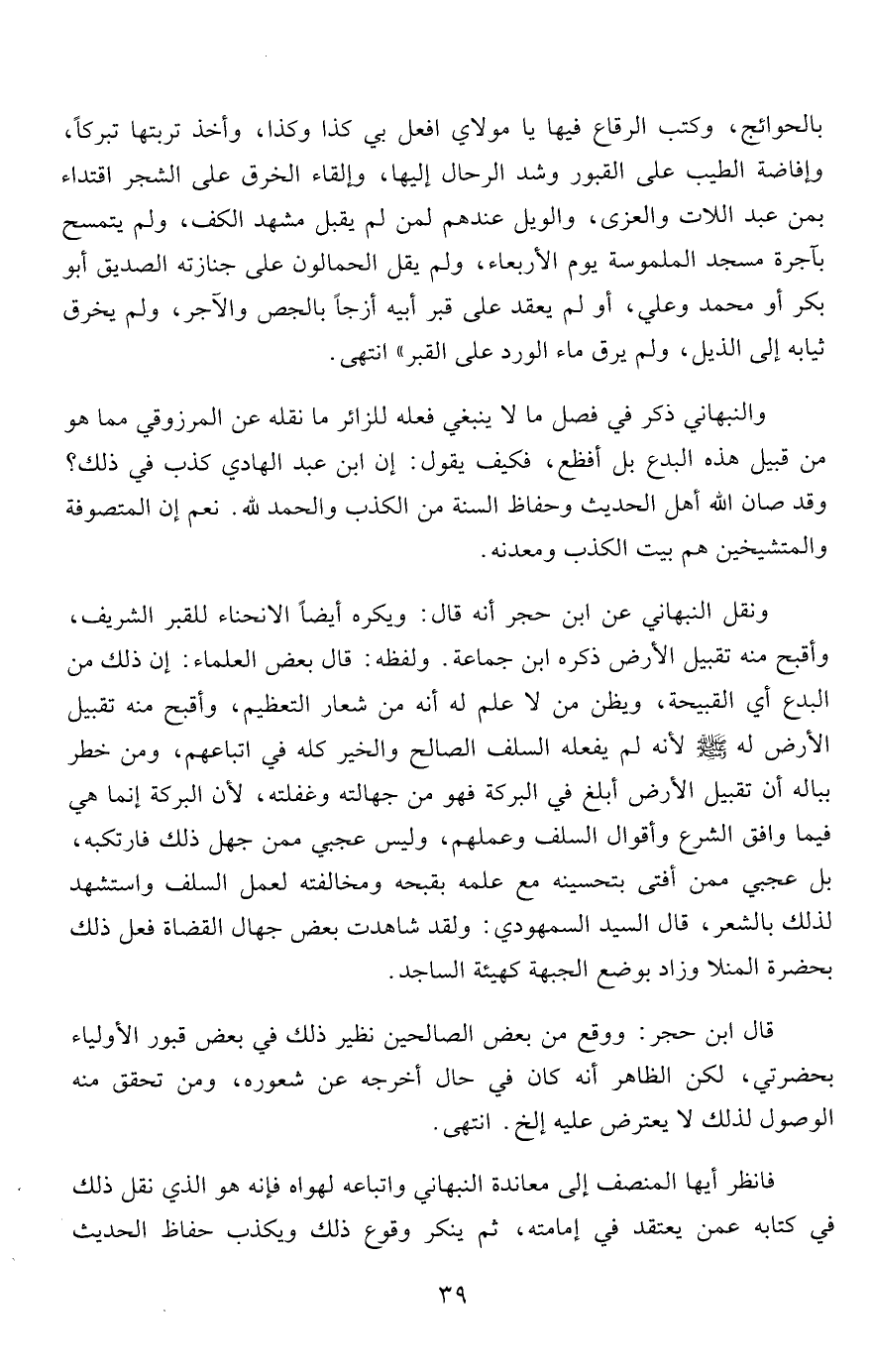والنبهاني ذكر في فصل ما لا ينبغي فعله للزائر ما نقله عن المرزوقي مما هو من قبيل هذه البدع بل أفظع، فكيف يقول: إن ابن عبد الهادي كذب في ذلك؟ وقد صان الله أهل الحديث وحفاظ السنة من الكذب والحمد لله. نعم إن المتصوفة والمتشيخين هم بيت الكذب ومعدنه.