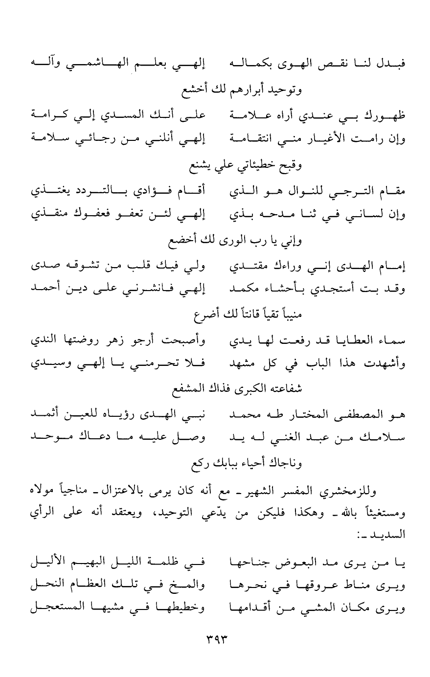 وللزمخشري المفسر الشهير- مع أنه كان يرمى بالاعتزال- مناجياً مولاه ومستغيثاً بالله- وهكذا فليكن من يدعي التوحيد، ويعتقد أنه على الرأي السديد-: