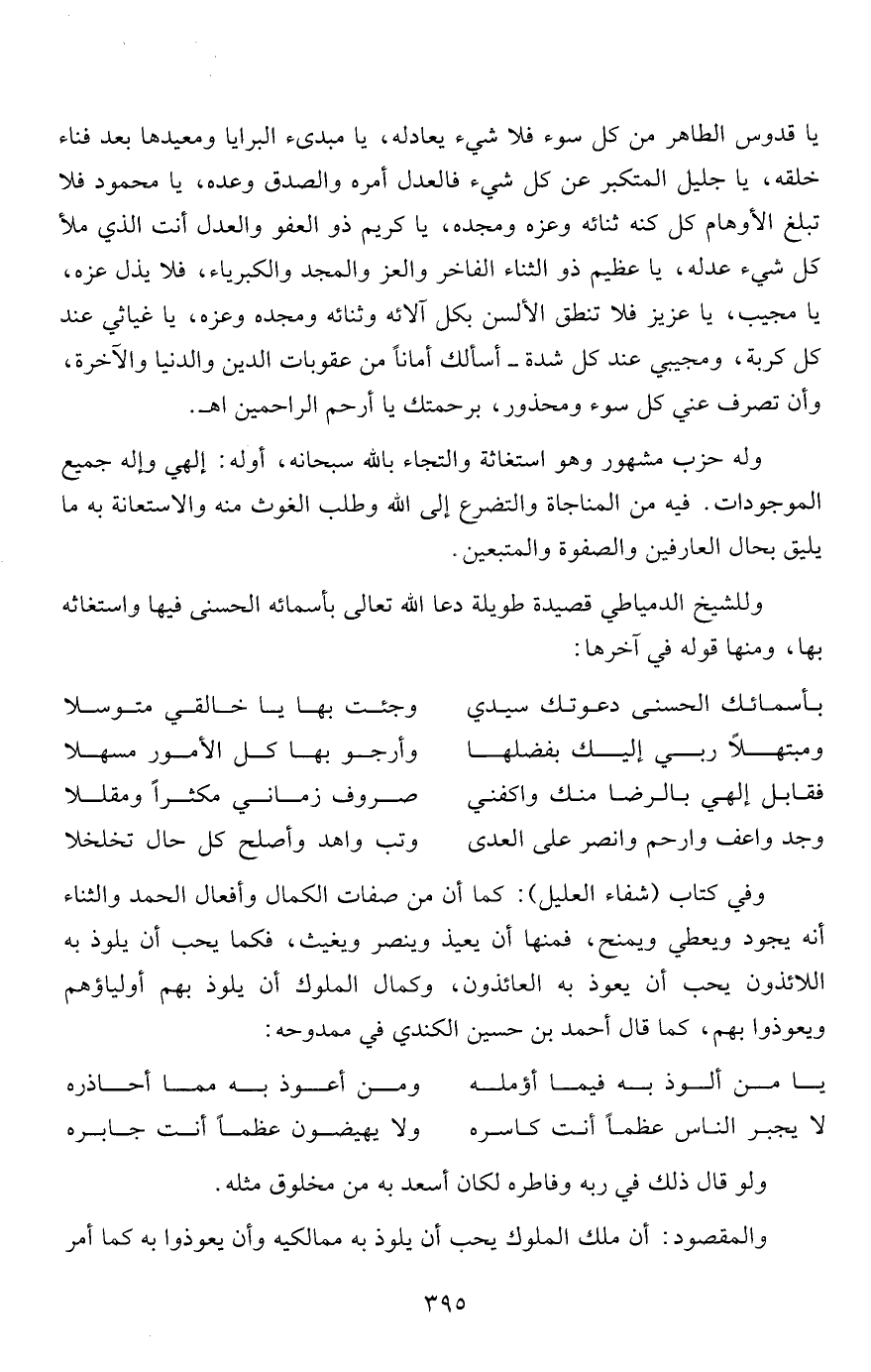 وللشيخ الدمياطي قصيدة طويلة دعا الله تعالى بأسمائه الحسنى فيها واستغاثه بها، ومنها قوله في آخرها: