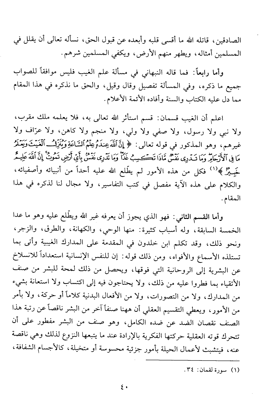 وأما رابعاً: فما قاله النبهاني في مسألة علم الغيب فليس موافقاً للصواب جميع ما ذكره، وفي المسألة تفصيل وقال وقيل، والحق ما نذكره في هذا المقام مما دل عليه الكتاب والسنة وأفاده الأئمة الأعلام.
