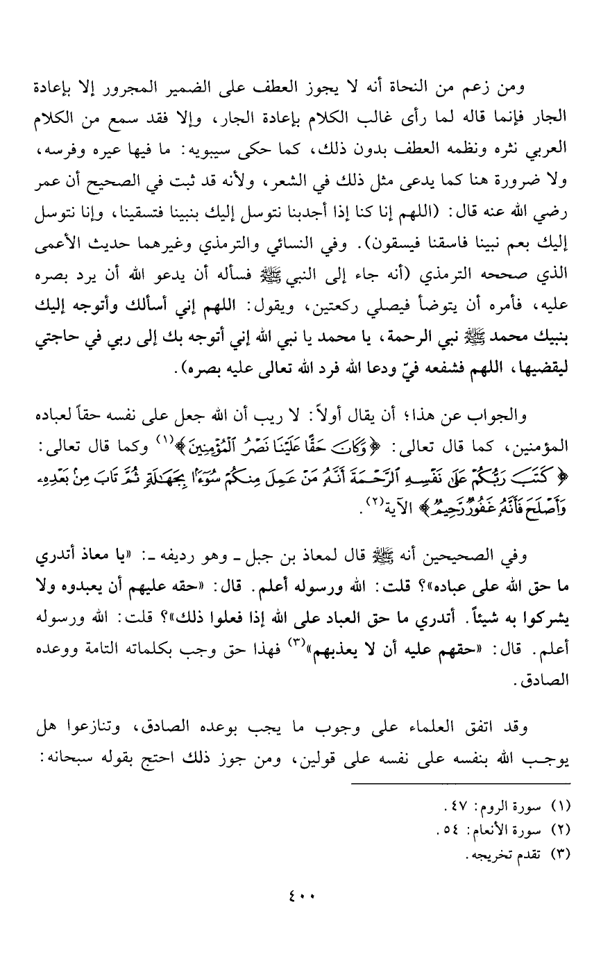 والجواب عن هذا؛ أن يقال أولاً: لا ريب أن الله جعل على نفسه حقاً لعباده المؤمنين، كما قال تعالى: {وَكَانَ حَقّاً عَلَيْنَا نَصْرُ الْمُؤْمِنِينَ} 1 وكما قال تعالى: {كَتَبَ رَبُّكُمْ عَلَى نَفْسِهِ الرَّحْمَةَ أَنَّهُ مَنْ عَمِلَ مِنْكُمْ سُوءاً بِجَهَالَةٍ ثُمَّ تَابَ مِنْ بَعْدِهِ وَأَصْلَحَ فَأَنَّهُ غَفُورٌ رَحِيمٌ} الآية2.