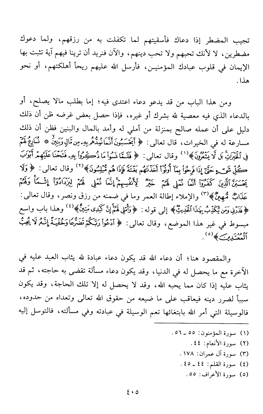 ومن هذا الباب من قد يدعو دعاء اعتدى فيه؛ إما بطلب ما لا يصلح، أو بالدعاء الذي فيه معصية لله بشرك أو غيره، فإذا حصل بعض غرضه ظن أن ذلك دليل على أن عمله صالح بمنزلة من أملي له وأمد بالمال والبنين فظن أن ذلك مسارعة له في الخيرات، قال تعالى: {أَيَحْسَبُونَ أَنَّمَا نُمِدُّهُمْ بِهِ مِنْ مَالٍ وَبَنِينَ * نُسَارِعُ لَهُمْ فِي الْخَيْرَاتِ بَلْ لا يَشْعُرُونَ} 1 وقال تعالى: {فَلَمَّا نَسُوا مَا ذُكِّرُوا بِهِ فَتَحْنَا عَلَيْهِمْ أَبْوَابَ كُلِّ شَيْءٍ حَتَّى إِذَا فَرِحُوا بِمَا أُوتُوا أَخَذْنَاهُمْ بَغْتَةً فَإِذَا هُمْ مُبْلِسُونَ} 2 وقال تعالى: {وَلا يَحْسَبَنَّ الَّذِينَ كَفَرُوا أَنَّمَا نُمْلِي لَهُمْ خَيْرٌ لِأَنْفُسِهِمْ إِنَّمَا نُمْلِي لَهُمْ لِيَزْدَادُوا إِثْماً وَلَهُمْ عَذَابٌ مُهِينٌ} 3 والإملاء إطالة العمر وما في ضمنه من رزق ونصر، وقال تعالى: {فَذَرْنِي وَمَنْ يُكَذِّبُ بِهَذَا الْحَدِيثِ} إلى قوله: {وَأُمْلِي لَهُمْ إِنَّ كَيْدِي مَتِينٌ} 4 وهذا باب واسع مبسوط في غير هذا الموضع، وقال تعالى: {ادْعُوا رَبَّكُمْ تَضَرُّعاً وَخُفْيَةً إِنَّهُ لا يُحِبُّ الْمُعْتَدِينَ} 5.