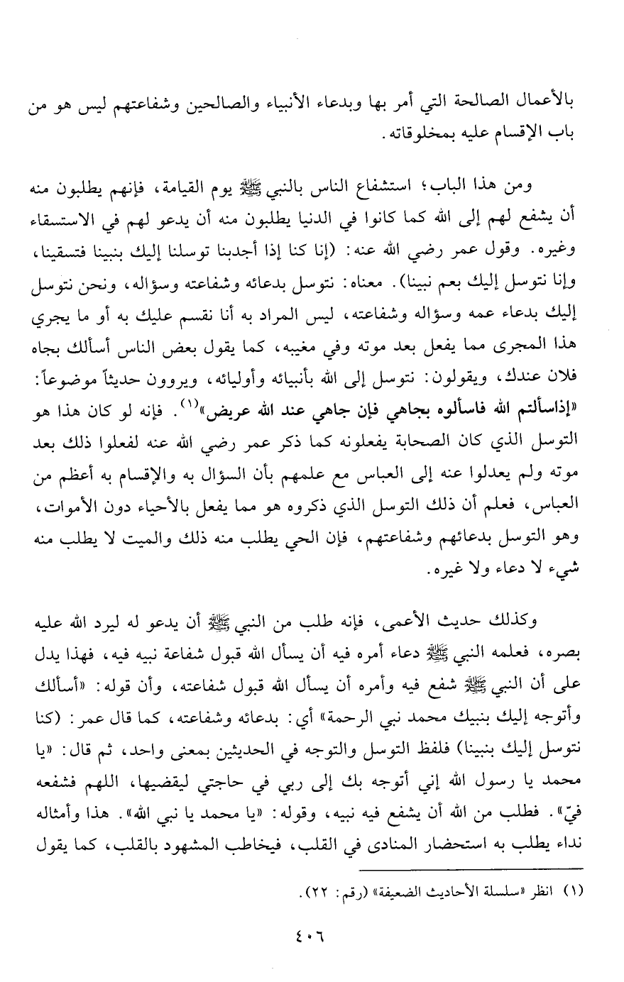 ومن هذا الباب، استشفاع الناس بالنبي صلى الله عليه وسلم يوم القيامة، فإنهم يطلبون منه أن يشفع لهم إلى الله كما كانوا في الدنيا يطلبون منه أن يدعو لهم في الاستسقاء وغيره. وقول عمر رضي الله عنه: "إنا كنا إذا أجدبنا توسلنا إليك بنبينا فتسقينا، وإنا نتوسل إليك بعم نبينا". معناه: نتوسل بدعائه وشفاعته وسؤاله، ونحن نتوسل إليك بدعاء عمه وسؤاله وشفاعته، ليس المراد به أنا نقسم عليك به أو ما يجري هذا المجرى مما يفعل بعد موته وفي مغيبه، كما يقول بعض الناس أسألك بجاه فلان عندك، ويقولون: نتوسل إلى الله بأنبيائه وأوليائه، ويروون حديثاً موضوعاً: "إذا سألتم الله فاسألوه بجاهي فإن جاهي عند الله عريض"1. فإنه لو كان هذا هو التوسل الذي كان الصحابة يفعلونه كما ذكر عمر رضي الله عنه لفعلوا ذلك بعد موته ولم يعدلوا عنه إلى العباس مع علمهم بأن السؤال به والإقسام به أعظم من العباس، فعلم أن ذلك التوسل الذي ذكروه هو مما يفعل بالأحياء دون الأموات، وهو التوسل بدعائهم وشفاعتهم، فإن الحي يطلب منه ذلك والميت لا يطلب منه شيء لا دعاء ولا غيره.
