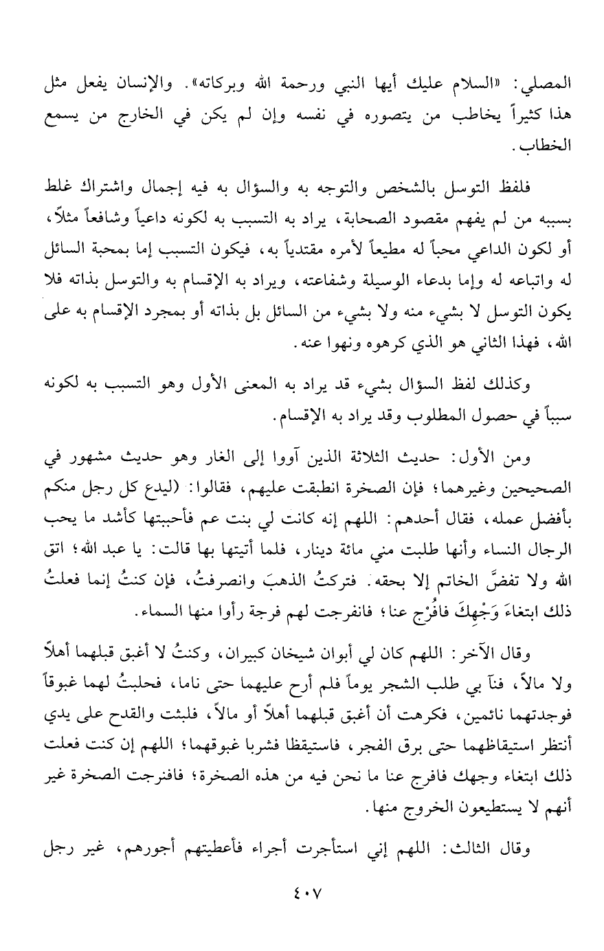 فلفظ التوسل بالشخص والتوجه به والسؤال به فيه إجمال واشتراك غلط بسببه من لم يفهم مقصود الصحابة، يراد به التسبب به لكونه داعياً وشافعاً مثلاً، أو لكون الداعي محباً له مطيعاً لأمره مقتدياً به، فيكون التسبب إما بمحبة السائل له واتباعه له وإما بدعاء الوسيلة وشفاعته، ويراد به الإقسام به والتوسل بذاته فلا يكون التوسل لا بشيء منه ولا بشيء من السائل بل بذاته أو بمجرد الإقسام به على الله، فهذا الثاني هو الذي كرهوه ونهوا عنه.