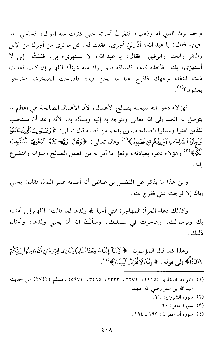 فهؤلاء دعوا الله سبحانه بصالح الأعمال، لأن الأعمال الصالحة هي أعظم ما يتوسل به العبد إلى الله تعالى ويتوجه به إليه ويسأله به، لأنه وعد أن يستجيب للذين آمنوا وعملوا الصالحات ويزيدهم من فضله قال تعالى: {وَيَسْتَجِيبُ الَّذِينَ آمَنُوا وَعَمِلُوا الصَّالِحَاتِ وَيَزِيدُهُمْ مِنْ فَضْلِهِ} 2 وقال تعالى: {وَقَالَ رَبُّكُمُ ادْعُونِي أَسْتَجِبْ لَكُمْ} 3 وهؤلاء دعوه بعبادته، وفعل ما أمر به من العمل الصالح وسؤاله والتضرع إليه.