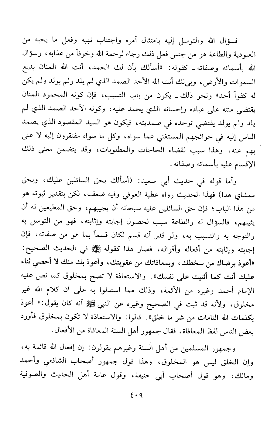 وأما قوله في حديث أبي سعيد: "أسألك بحق السائلين عليك، وبحق ممشاي هذا" فهذا الحديث رواه عطية العوفي وفيه ضعف، لكن بتقدير ثبوته هو من هذا الباب؛ فإن حق السائلين عليه سبحانه أن يجيبهم، وحق المطيعين له أن يثيبهم، فالسؤال له والطاعة سبب لحصول إجابته وإثابته، فهو من التوسل به والتوجه به والتسبب به، ولو قدر أنه قسم لكان قسماً بما هو من صفاته، فإن إجابته وإثابته من أفعاله وأقواله، فصار هذا كقوله صلى الله عليه وسلم في الحديث الصحيح: " أعوذ برضاك من سخطك، وبمعافاتك من عقوبتك، وأعوذ بك منك لا أحصي ثناء عليك أنت كما أثنيت على نفسك". والاستعاذة لا تصح بمخلوق كما نص عليه الإمام أحمد وغيره من الأئمة، وذلك مما استدلوا به على أن كلام الله عير مخلوق، ولأنه قد ثبت في الصحيح وغيره عن النبي صلى الله عليه وسلم أنه كان يقول: "أعوذ بكلمات الله التامات من شر ما خلق". قالوا: والاستعاذة لا تكون بمخلوق فأورد بعض الناس لفظ المعافاة، فقال جمهور أهل السنة المعافاة من الأفعال.