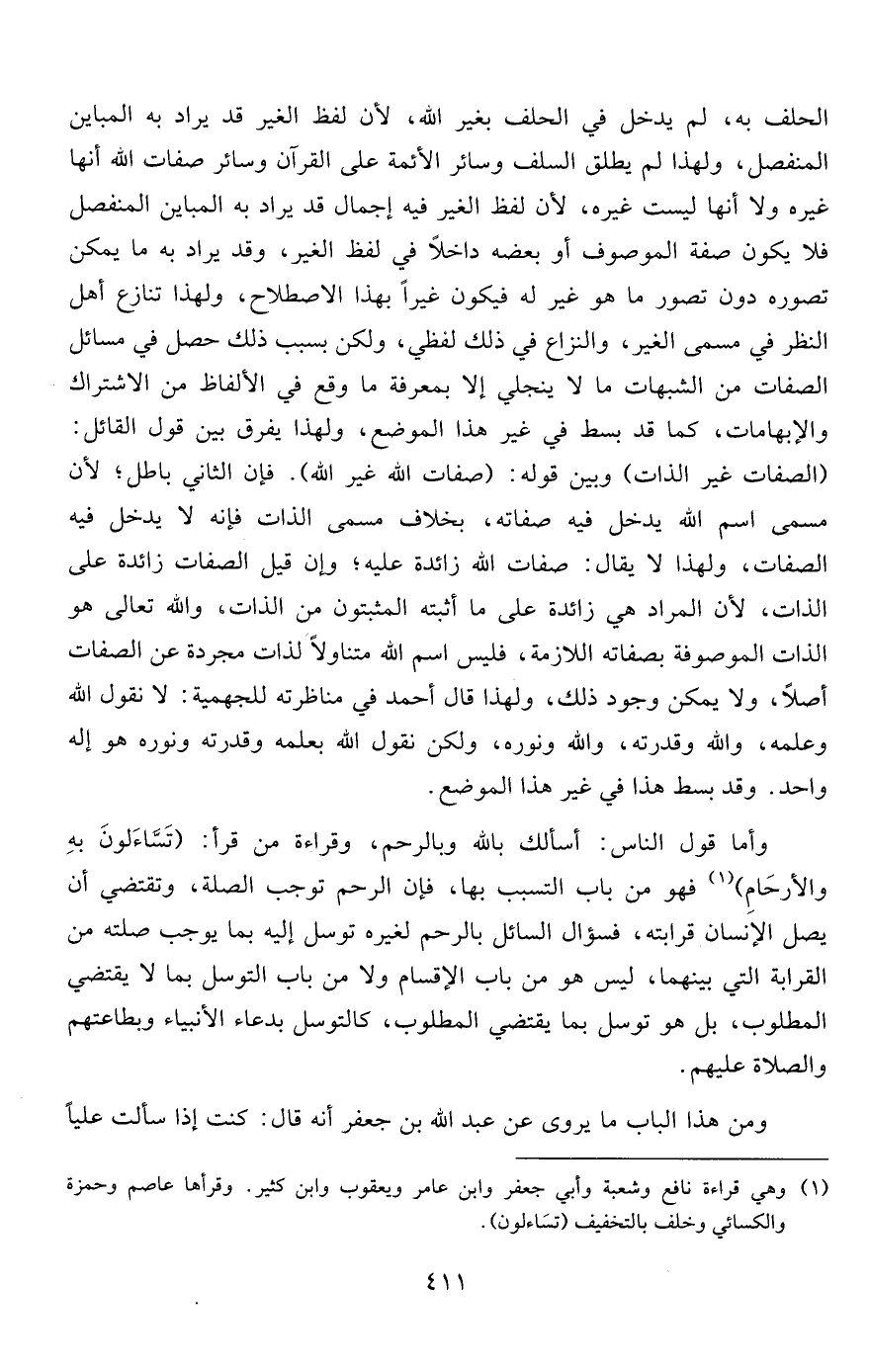 الحلف به، لم يدخل في الحلف بغير الله، لأن لفظ الغير قد يراد به المباين المنفصل، ولهذا لم يطلق السلف وسائر الأئمة على القرآن وسائر صفات الله أنها غيره ولا أنها ليست غيره، لأن لفظ الغير فيه إجمال قد يراد به المباين المنفصل فلا يكون صفة الموصوف أو بعضه داخلاً في لفظ الغير، وقد يراد به ما يمكن تصوره دون تصور ما هو غير له فيكون غيراً بهذا الاصطلاح، ولهذا تنازع أهل النظر في مسمى الغير، والنزاع في ذلك لفظي، ولكن بسبب ذلك حصل في مسائل الصفات من الشبهات ما لا ينجلي إلا بمعرفة ما وقع في الألفاظ من الاشتراك والإبهامات، كما قد بسط في غير هذا الموضع، ولهذا يفرق بين قول القائل: (الصفات غير الذات) وبين قوله: (صفات الله غير الله) . فإن الثاني باطل؛ لأن مسمى اسم الله يدخل فيه صفاته، بخلاف مسمى الذات فإنه لا يدخل فيه الصفات، ولهذا لا يقال: صفات الله زائدة عليه؛ وإن قيل الصفات زائدة على الذات، لأن المراد هي زائدة على ما أثبته المثبتون من الذات، والله تعالى هو الذات الموصوفة بصفاته اللازمة، فليس اسم الله متناولاً لذات مجردة عن الصفات أصلاً، ولا يمكن وجود ذلك، ولهذا قال أحمد في مناظرته للجهمية: لا نقول الله وعلمه، والله وقدرته، والله ونوره، ولكن نقول الله بعلمه وقدرته ونوره هو إله واحد. وقد بسط هذا في غير هذا الموضع.
