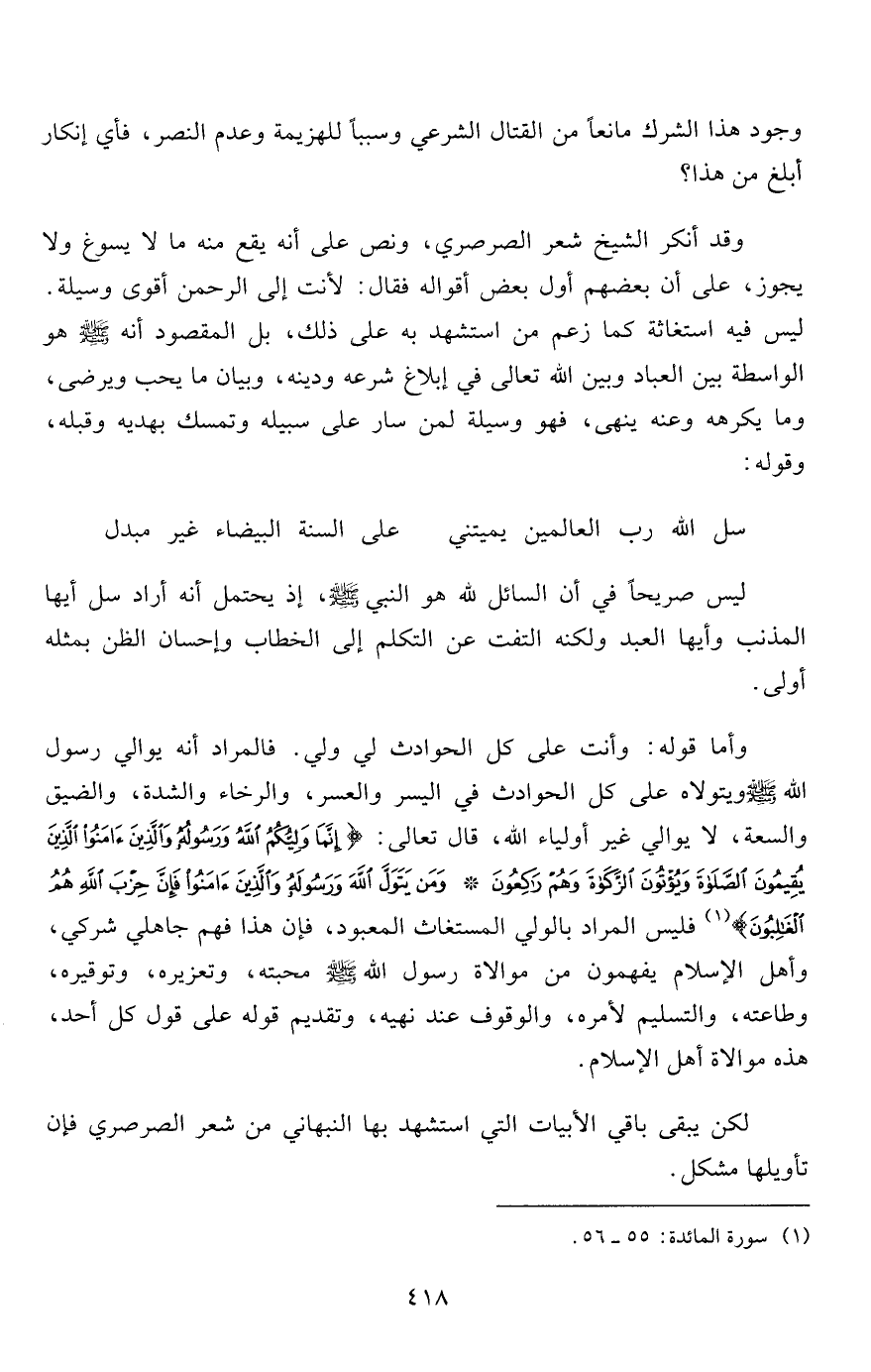 وقد أنكر الشيخ شعر الصرصري، ونص على أنه يقع منه ما لا يسوغ ولا يجوز، على أن بعضهم أول بعض أقواله فقال: لأنت إلى الرحمن أقوى وسيلة. ليس فيه استغاثة كما زعم من استشهد به على ذلك، بل المقصود أنه صلى الله عليه وسلم هو الواسطة بين العباد وبين الله تعالى في إبلاع شرعه ودينه، وبيان ما يحب ويرضى، وما يكرهه وعنه ينهى، فهو وسيلة لمن سار على سبيله وتمسك بهديه وقبله، وقوله: