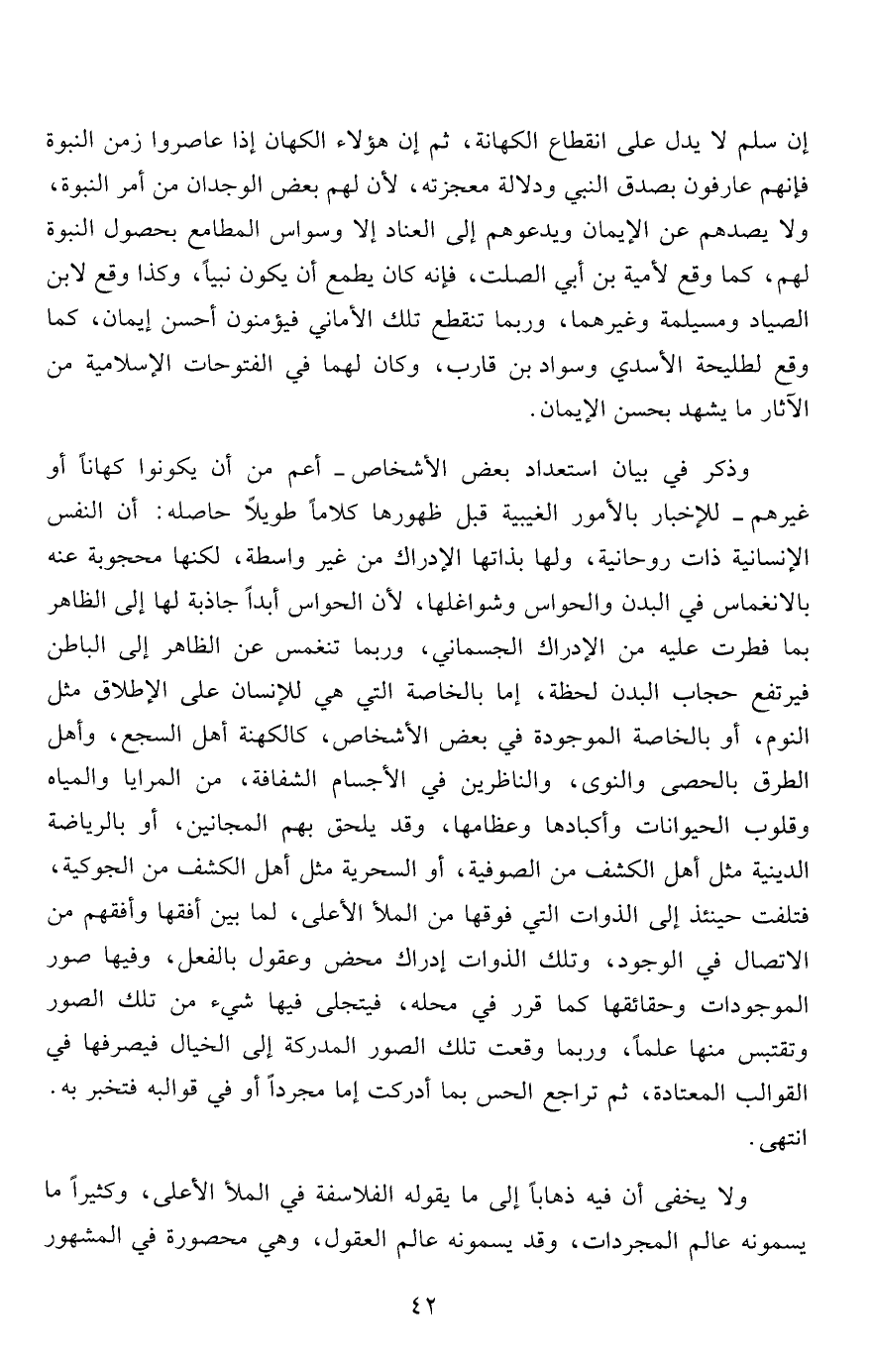 إن سلم لا يدل على انقطاع الكهانة، ثم إن هؤلاء الكهان إذا عاصروا زمن النبوة فإنهم عارفون بصدق النبي ودلالة معجزته، لأن لهم بعض الوجدان من أمر النبوة، ولا يصدهم عن الإيمان ويدعوهم إلى العناد إلا وسواس المطامع بحصول النبوة لهم، كما وقع لأمية بن أبي الصلت، فإنه كان يطمع أن يكون نبياً، وكذا وقع لابن الصياد ومسيلمة وغيرهما، وربما تنقطع تلك الأماني فيؤمنون أحسن إيمان، كما وقع لطليحة الأسدي وسواد بن قارب، وكان لهما في الفتوحات الإسلامية من الآثار ما يشهد بحسن الإيمان. وذكر في بيان استعداد بعض الأشخاص أعم من أن يكونوا كهاناً أو غيرهم- للإخبار بالأمور الغيبية قبل ظهورها كلاماً طويلاً حاصله: أن النفس الإنسانية ذات روحانية، ولها بذاتها الإدراك من غير واسطة، لكنها محجوبة عنه بالانغماس في البدن والحواس وشواغلها، لأن الحواس أبداً جاذبة لها إلى الظاهر بما فطرت عليه من الإدراك الجسماني، وربما تنغمس عن الظاهر إلى الباطن فيرتفع حجاب البدن لحظة، إما بالخاصة التي هي للإنسان على الإطلاق مثل النوم، أو بالخاصة الموجودة في بعض الأشخاص، كالكهنة أهل السجع، وأهل الطرق بالحصى والنوى، والناظرين في الأجسام الشفافة، من المرايا والمياه وقلوب الحيوانات وأكبادها وعظامها، وقد يلحق بهم المجانين، أو بالرياضة الدينية مثل أهل الكشف من الصوفية، أو السحرية مثل أهل الكشف من الجوكية، فتلفت حينئذ إلى الذوات التي فوقها من الملأ الأعلى، لما بين أفقها وأفقهم من الاتصال في الوجود، وتلك الذوات إدراك محض وعقول بالفعل، وفيها صور الموجودات وحقائقها كما قرر في محله، فيتجلى فيها شيء من تلك الصور وتقتبس منها علماً، وربما وقعت تلك الصور المدركة إلى الخيال فيصرفها في القوالب المعتادة، ثم تراجع الحس بما أدركت إما مجرداً أو في قوالبه فتخبر به. انتهى.