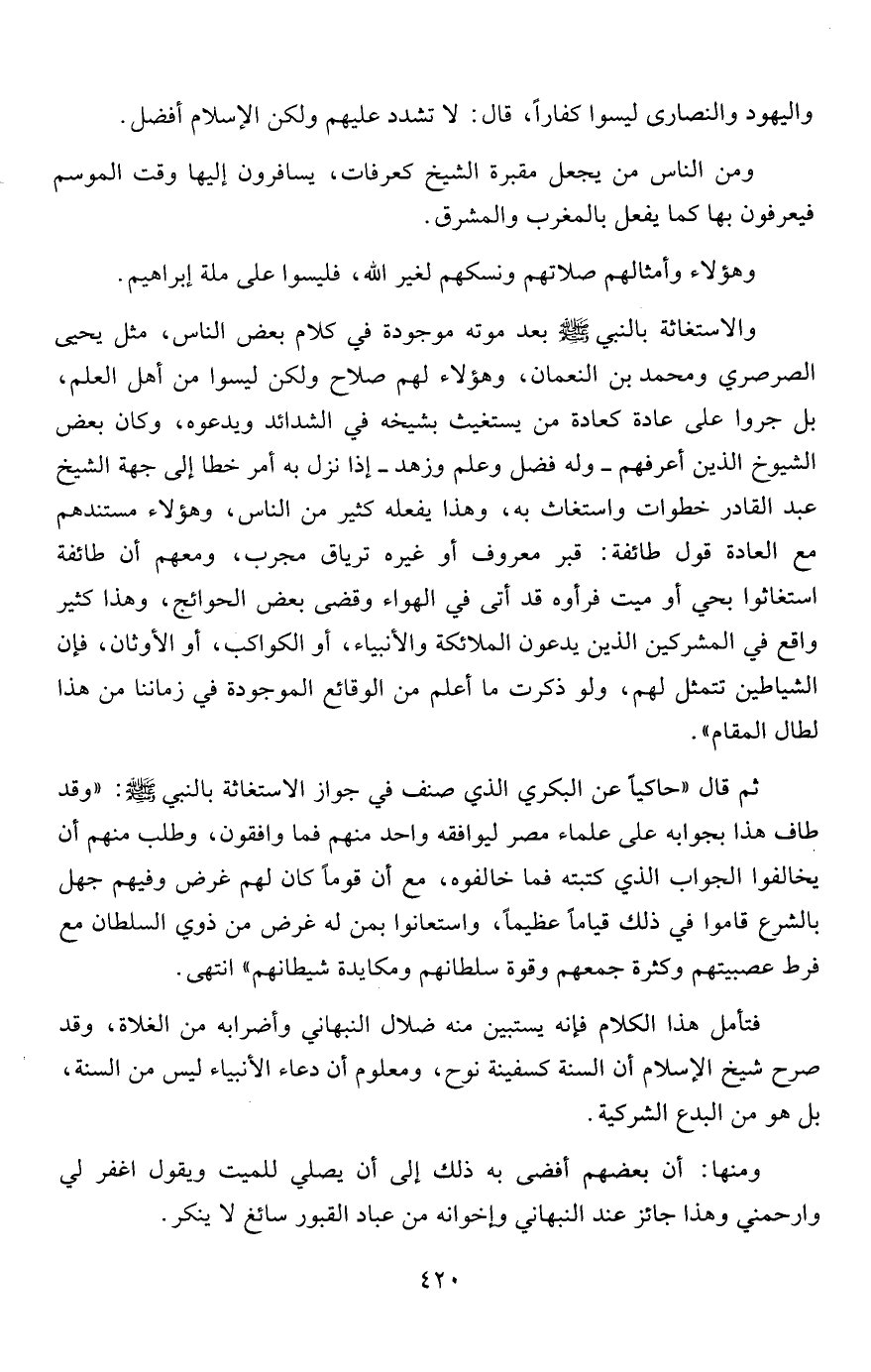 فتأمل هذا الكلام فإنه يستبين منه ضلال النبهاني وأضرابه من الغلاة، وقد صرح شيخ الإسلام أن السنة كسفينة نوح، ومعلوم أن دعاء الأنبياء ليس من السنة، بل هو من البدع الشركية.