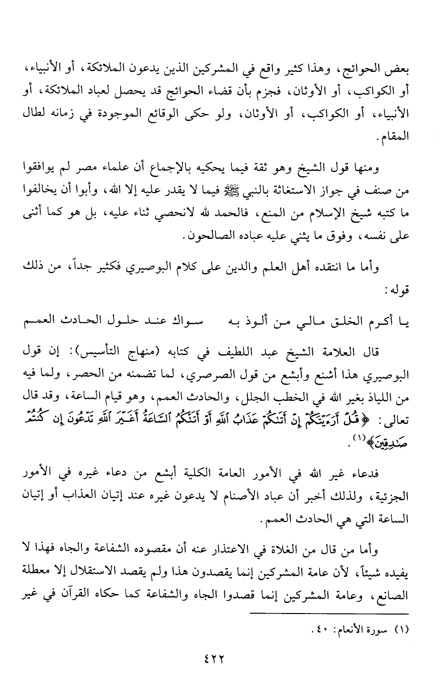 ومنها قول الشيخ وهو ثقة فيما يحكيه بالإجماع أن علماء مصر لم يوافقوا من صنف في جواز الاستغاثة بالنبي صلى الله عليه وسلم فيما لا يقدر عليه إلا الله، وأبوا أن يخالفوا ما كتبه شيخ الإسلام من المنع، فالحمد لله لا نحصي ثناء عليه، بل هو كما أثنى على نفسه، وفوق ما يثني عليه عباده الصالحون.