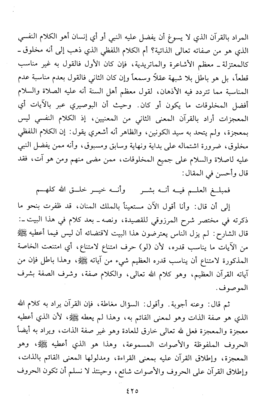 المراد بالقرآن الذي لا يسوغ أن يفضل عليه النبي أو أي إنسان أهو الكلام النفسي الذي هو من صفاته تعالى الذاتية؟ أم الكلام اللفظي الذي ذهب إلى أنه مخلوق- كالمعتزلة- معظم الأشاعرة والماتريدية، فإن كان الأول فالقول به غير مناسب قطعاً، بل هو باطل بلا شبهة عقلاً وسمعاً وإن كان الثاني فالقول بعدم مناسبة عدم المناسبة مما تتردد فيه الأذهان، لقول معظم أهل السنة أنه عليه الصلاه والسلام أفضل المخلوقات ما يكون أو كان. وحيث أن البوصيري عبر بالآيات أي المعجزات أراد بالقرآن المعنى الثاني من المعنيين، إذ الكلام النفسي ليس بمعجزة، ولم يتحد به سيد الكونين، والظاهر أنه أشعري يقول: إن الكلام اللفظي مخلوق، ضرورة اشتماله على بداية ونهاية وسابق ومسبوق، وأنه ممن يفضل النبي عليه الصلاة والسلام على جميع المخلوقات، ممن مضى منهم ومن هو آت، فقد قال وأحسن في المقال: